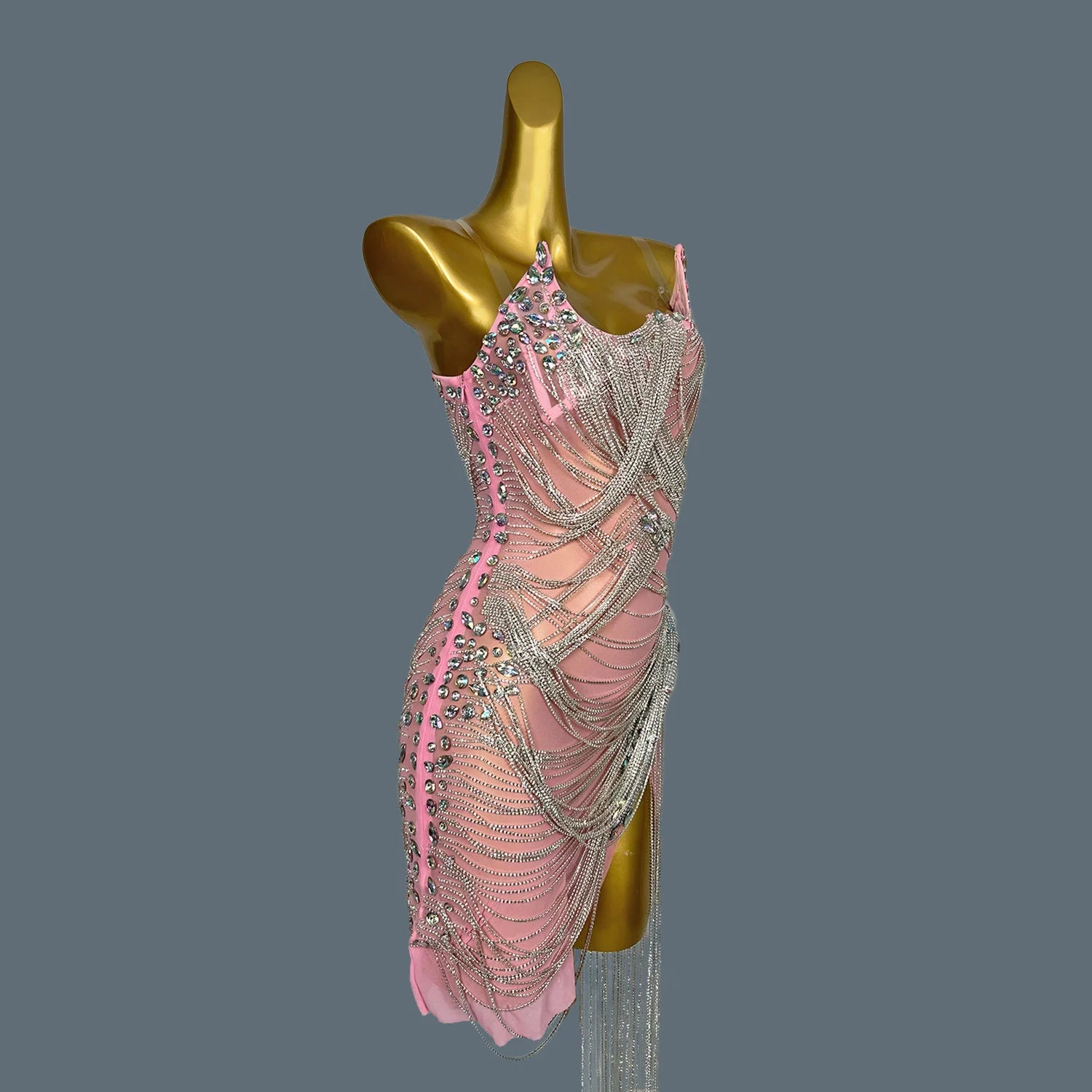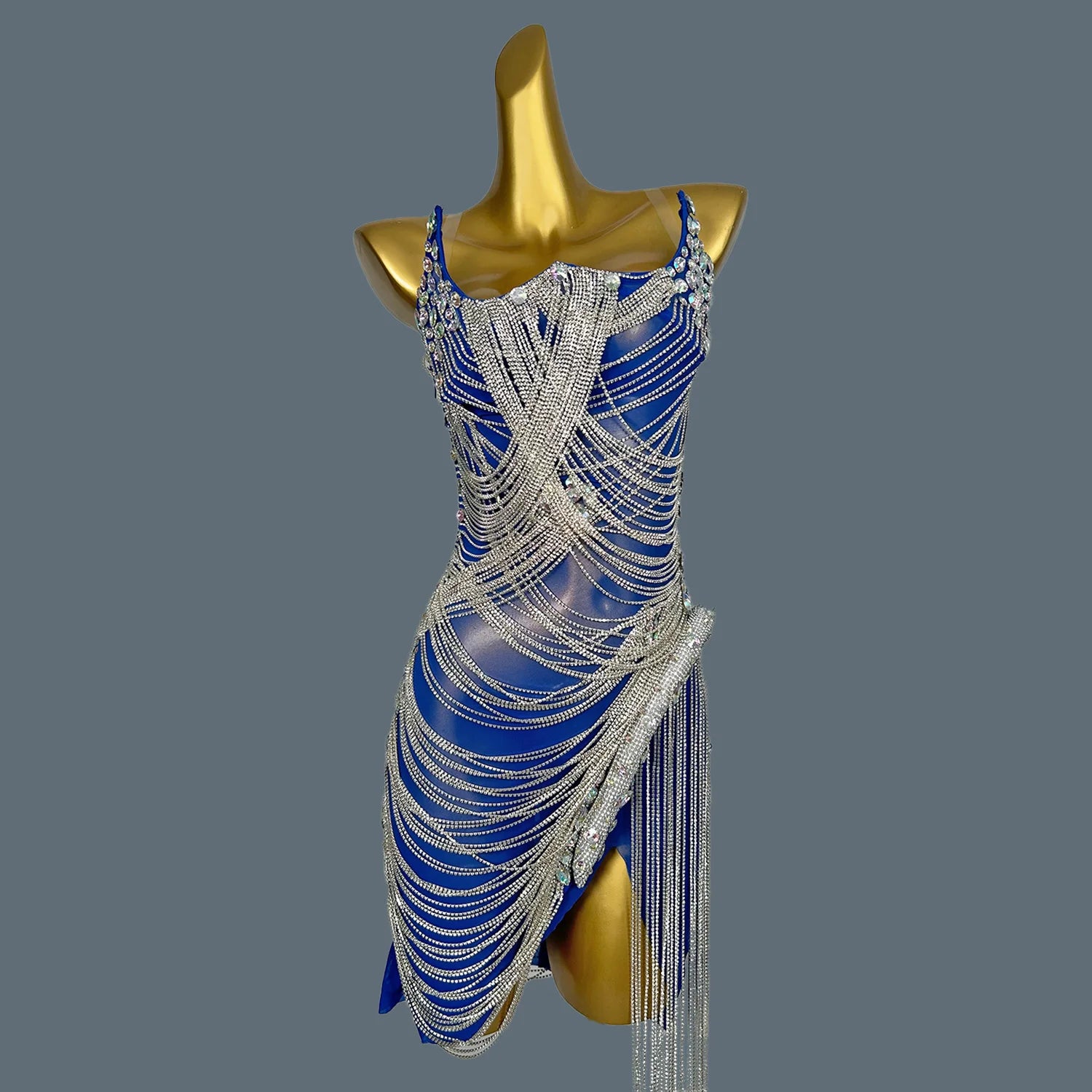 Women Shiny Crystal Chain Diamonds Dress Elastic Sexy Tassel Mini Dress Nightclub Show Costume Birthday Party Dress Tassel Luoli