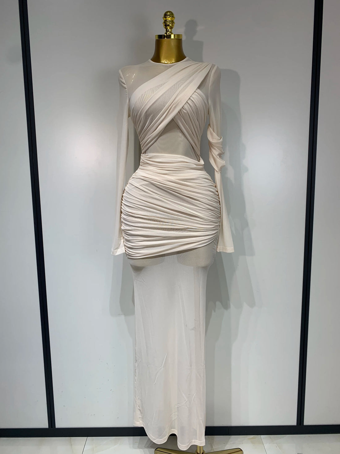 Elegant Mesh Fold Long Sleeve Bodycon Dress Women 2025 Evening Party Club Sexy Perspective Fashion Luxury Birthday Dresses