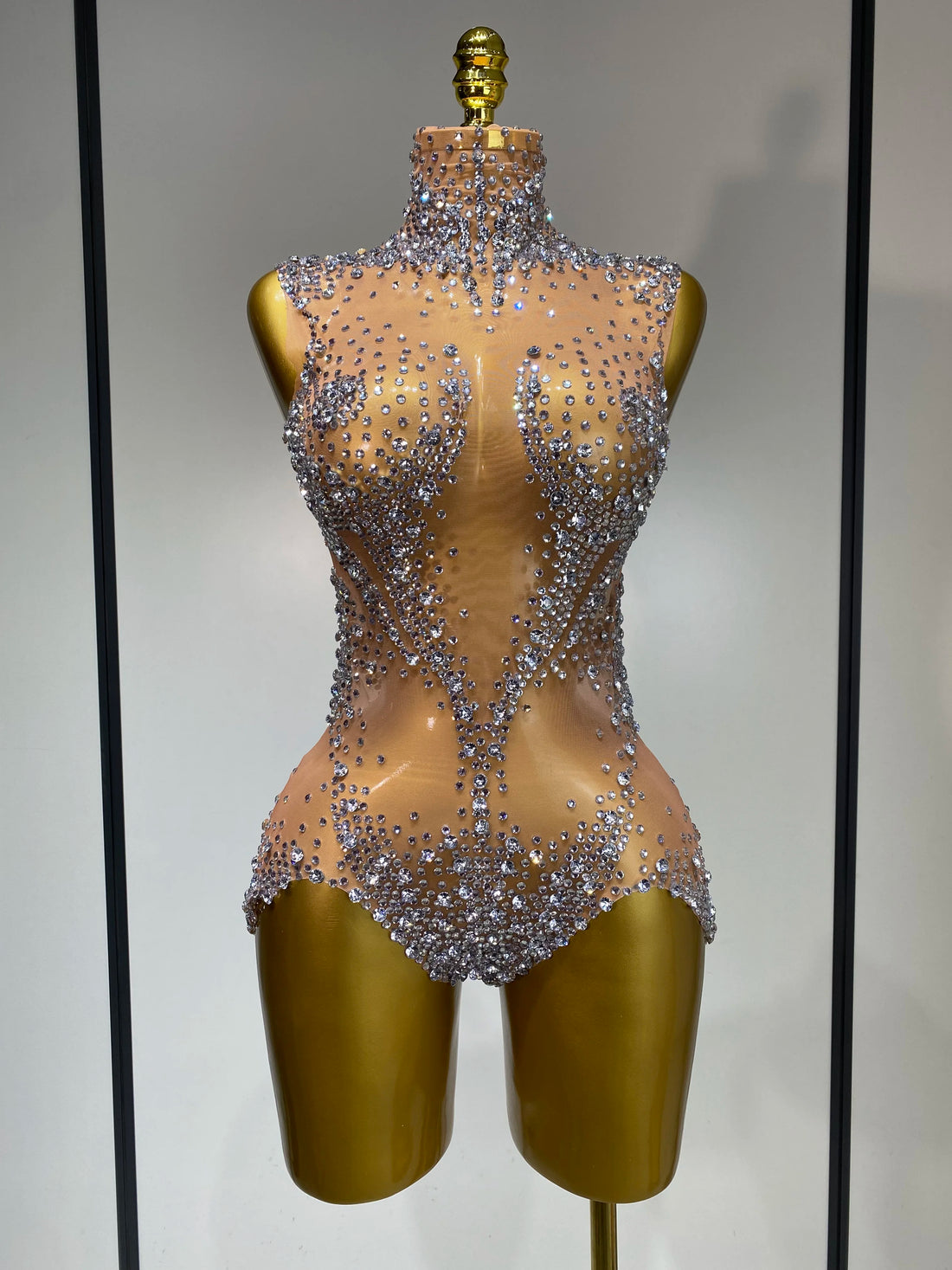 Women Sexy See Through Crystal Bodysuits Luxury Birthday Dancer Stage Performance Wear Mesh Sparkly Rhinestone Nightclub Outfit