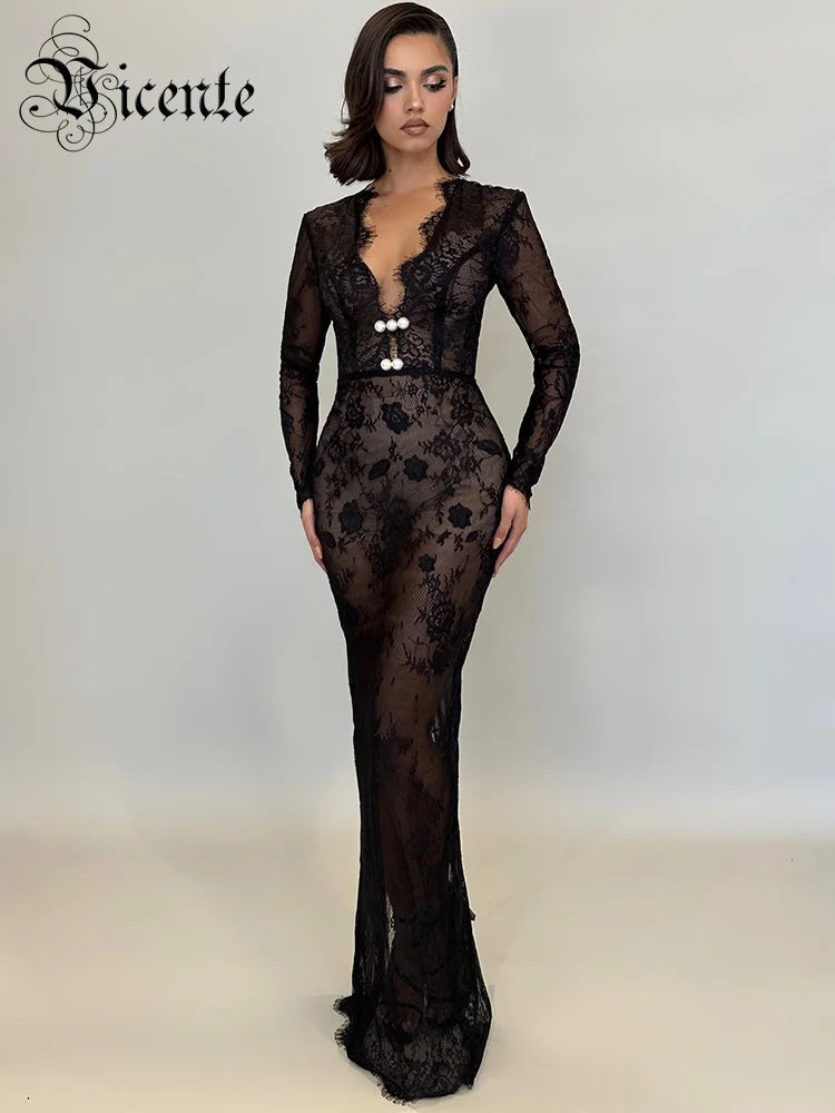 VC Black Long Dresses For Women Sexy V Neck Long Sleeve Lace Evening Maxi Gown Fashion Summer Dresses 2024