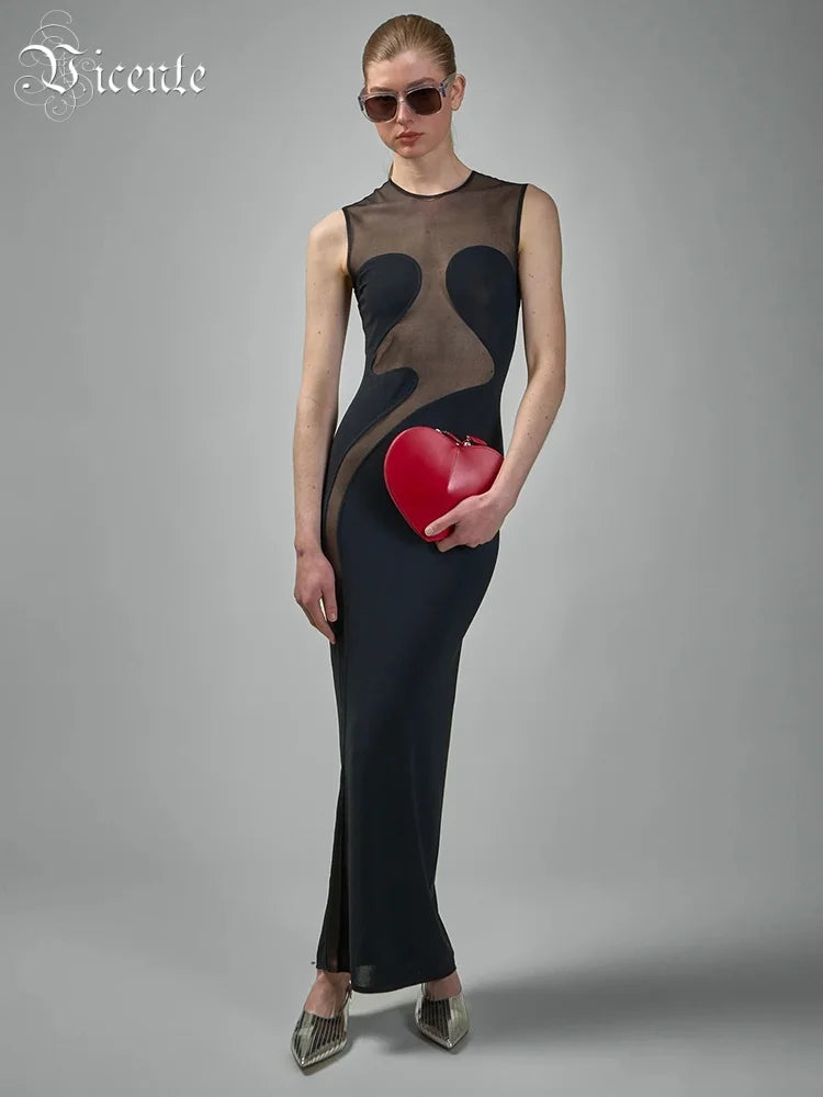 VC Cool Fashion Black White Sheer Mesh Sleeveless O-Neck Ankle Dress for Party Date Night Evening Gown
