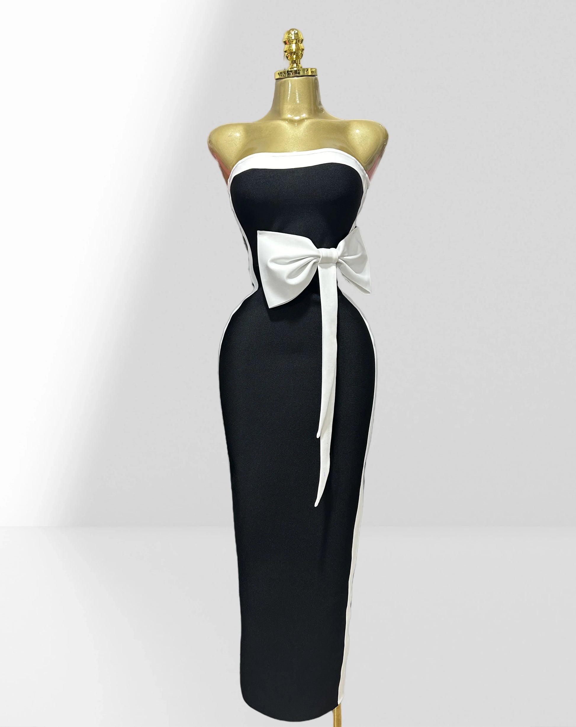 2025 Graceful Bow Sleeveless Strapless Sheath Black Bandage Ankle Lengh Dress Woman Party Vestido Celebrity Cocktail Outfit