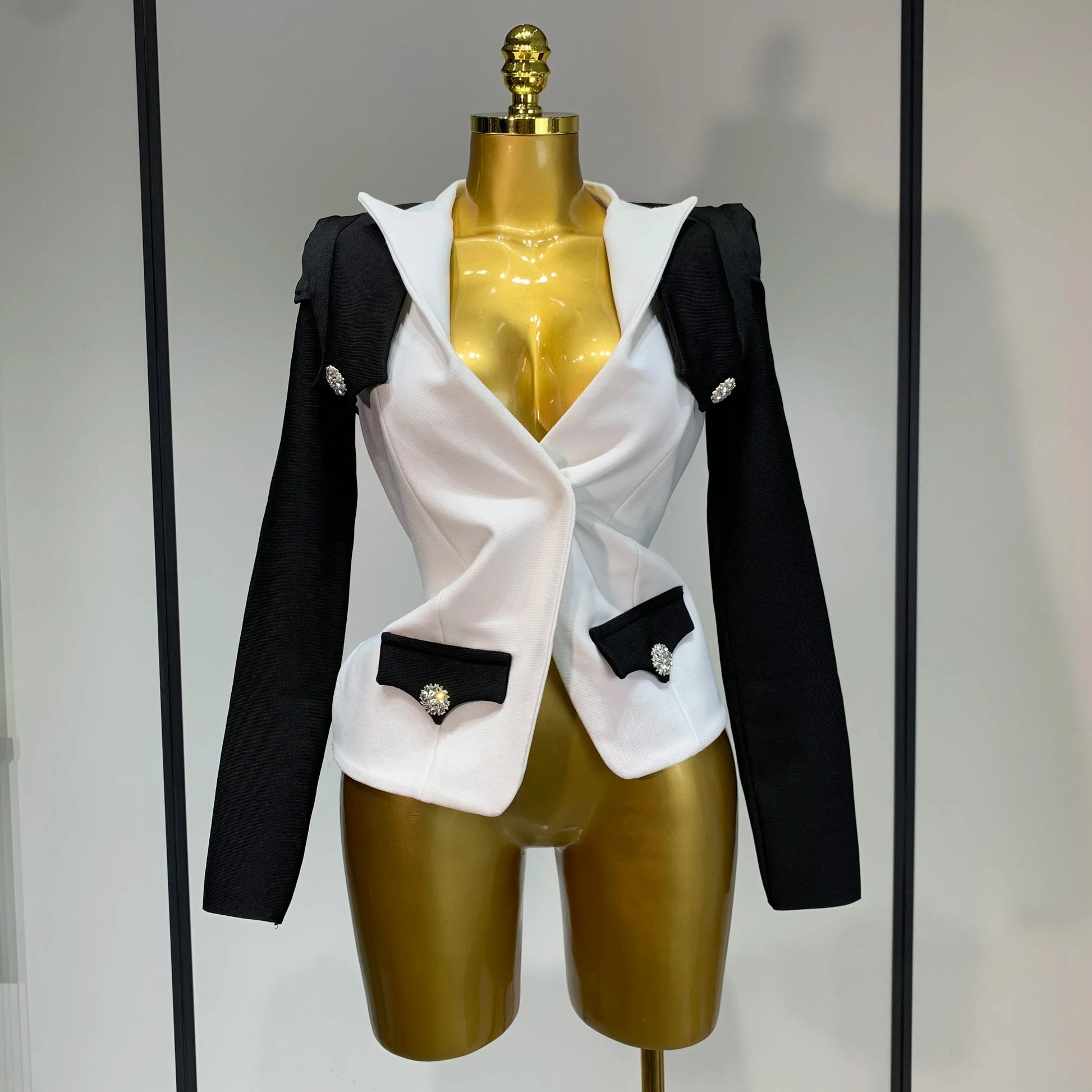 2025 New Designer Fashion Black White Bandage Jacket Two Piece Set Women Slim Fit Diamond Button Suit Jackets Coat