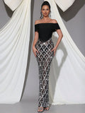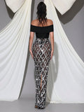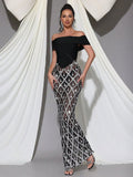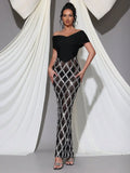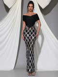 2025 Spring Sexy Women's Chiffon Patchwork Sparkle Nail Bead Long Dress V-neck Short Sleeve Bodycon Dress Cocktail Banquet Dress