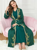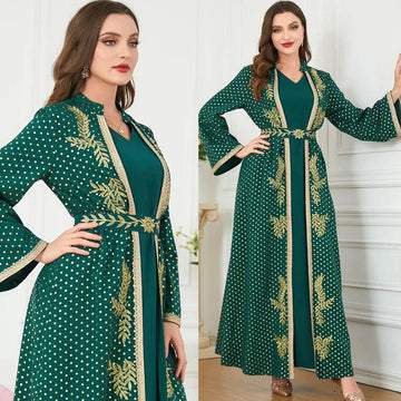 Abaya de l'Aïd pour femmes, broderie de feuilles de printemps, ruban en dentelle, caftan ceinturé, imprimé à pois, abayas ouvertes sur le devant, ensemble musulman 2 pièces