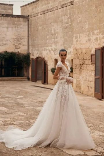 Charmante robe de mariée dos nu pour femme, col en V, motif floral 3D scintillant, traîne courte, paillettes, robe de mariée personnalisée