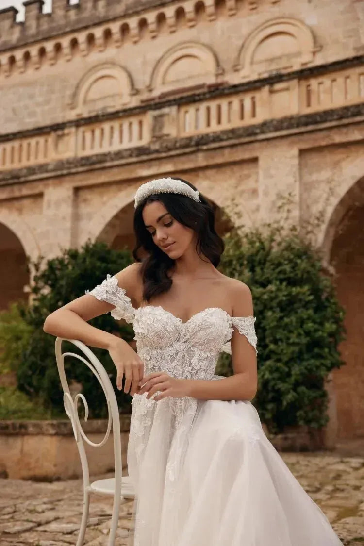 Charmante robe de mariée trapèze en dentelle, décolleté en cœur, épaules dénudées, tulle, sur mesure