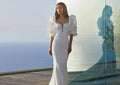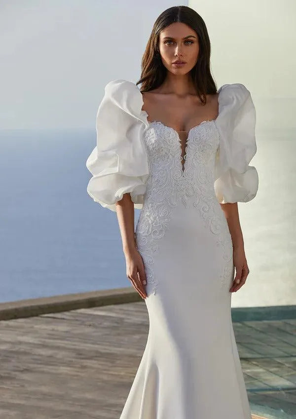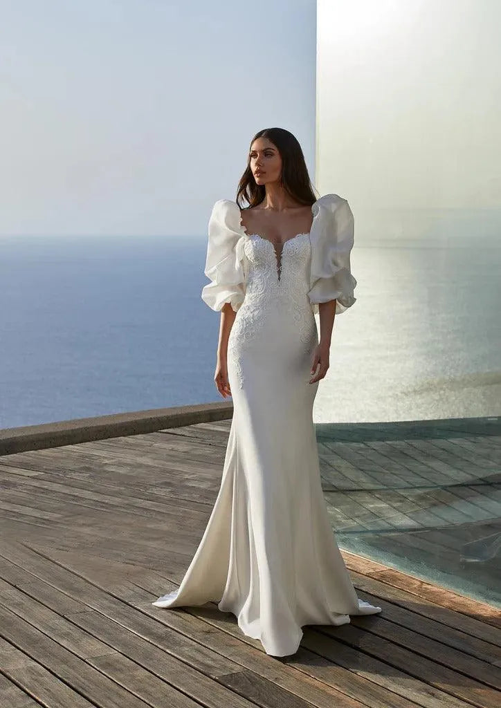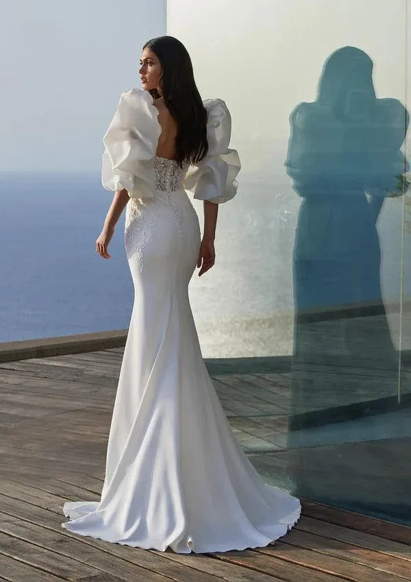 Robe de mariée sirène en satin à col carré, élégante, avec appliques en dentelle, dos nu, manches bouffantes, longueur au sol