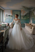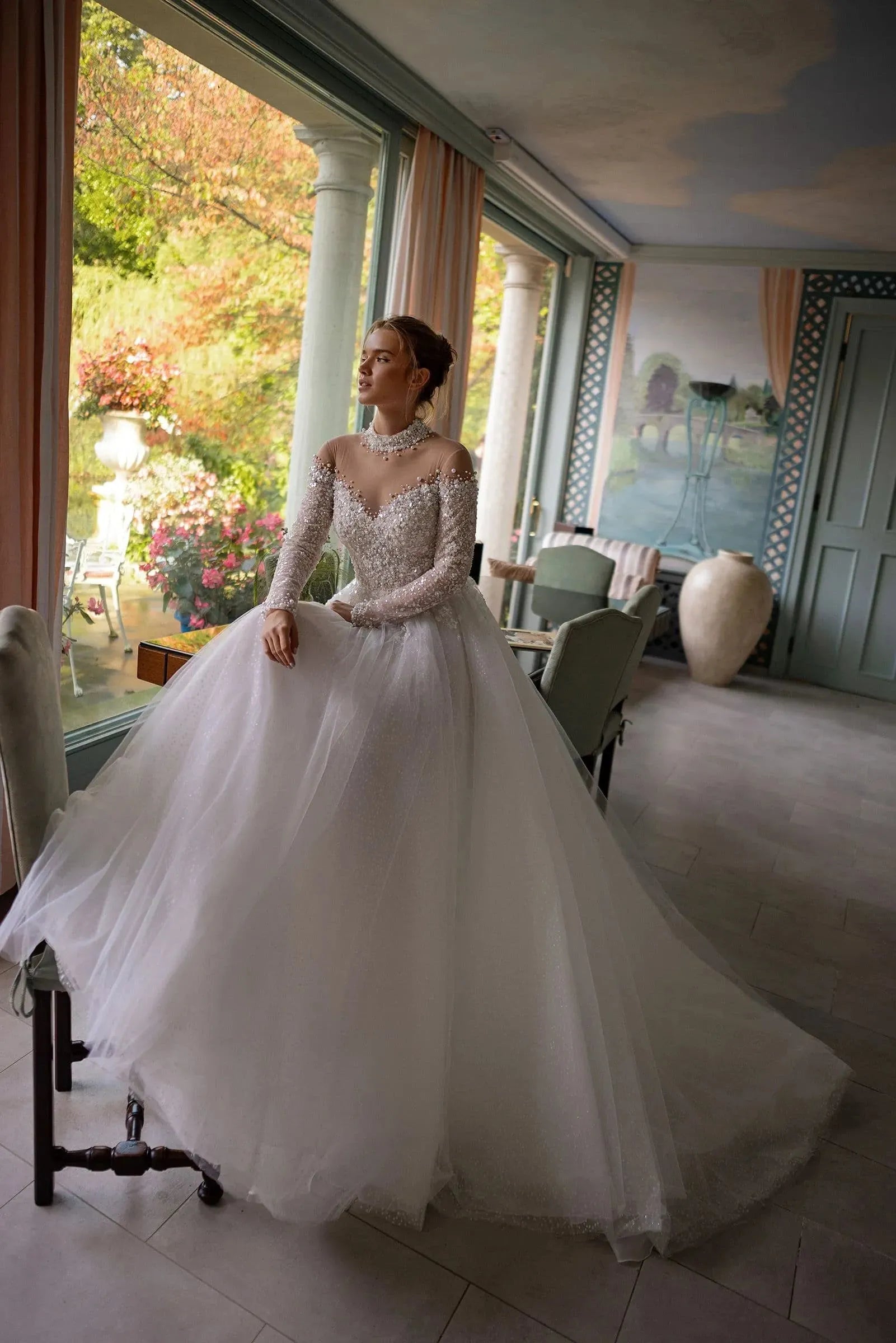 Robe de mariée glamour en tulle et paillettes, coupe trapèze, boutonnée, manches longues illusion