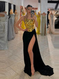 Gloden Mirror Surface Woman Set Short Strapless Tops And Package Hips Balck Skirt 2 Pieces Party Outfit Performance costume
