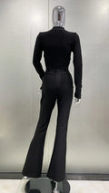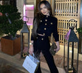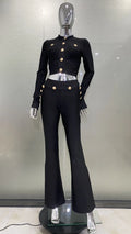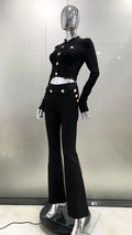 Bandage Expose Waist Woman Set Fashion Golden Buttons Short Coat Top And Flare Pants 2 Pieces High Street Wear