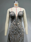 Luxury Diamonds Beading Sexy High Slit V-Neck Strapless Ankle Length Dress Goddess Dress Celebrity Evening Party Outfit