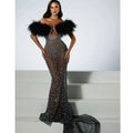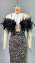 Luxury Feather Dazzling Diamonds Sexy Mesh See Through Black Floor Length Dress Goddess Evening Party Dress Red Carpet Vestido