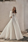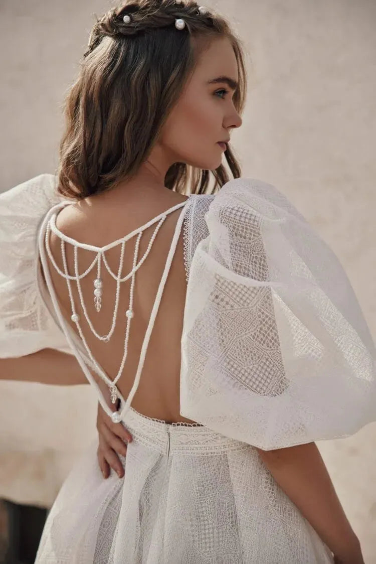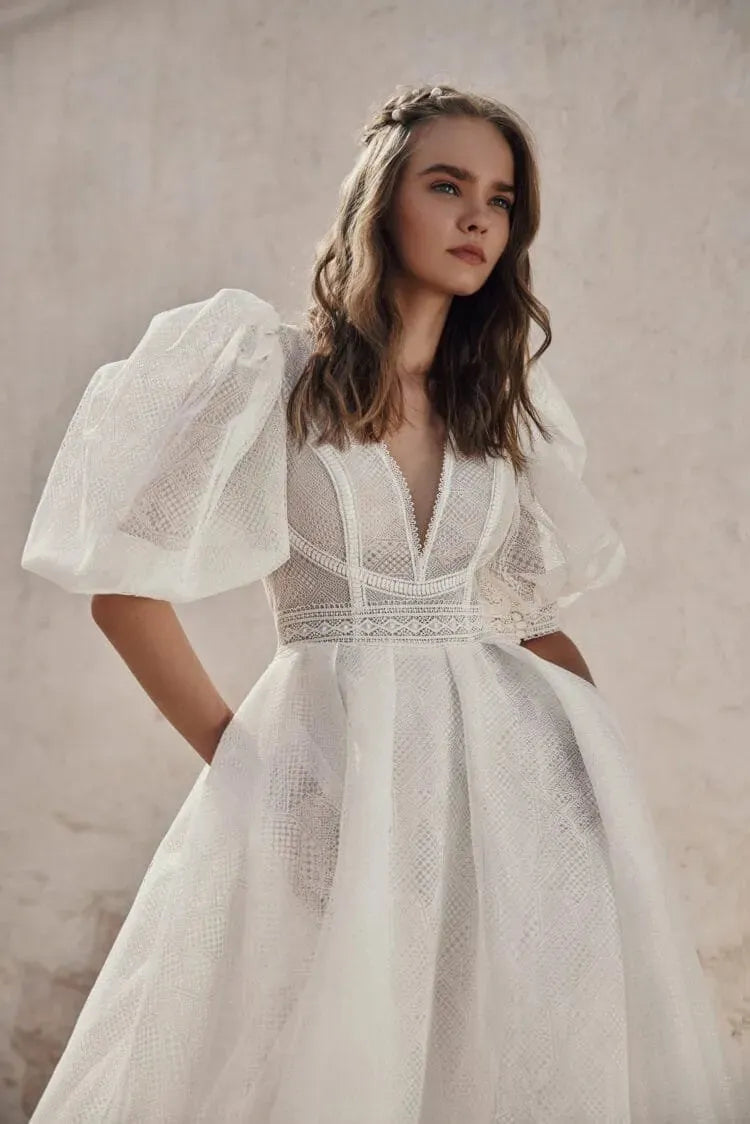 Robe de mariée bohème fantaisiste avec manches bouffantes, décolleté en V, détails en dentelle délicats et silhouette trapèze fluide pour un look de mariée romantique et sans effort