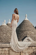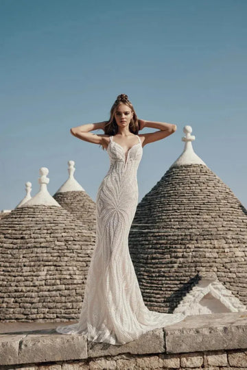 Robe de mariée bohème romantique à manches longues, décolleté en cœur et dentelle élégante dans une silhouette sirène flatteuse pour un look de mariée à couper le souffle