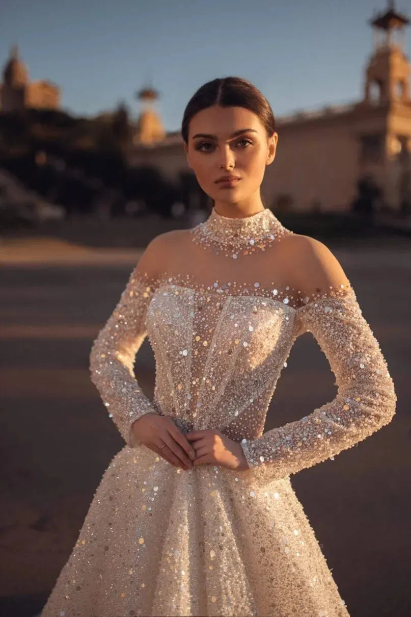 Robe de mariée éblouissante en tulle pailleté, paillettes scintillantes et détails complexes pour un look de mariée époustouflant et sophistiqué