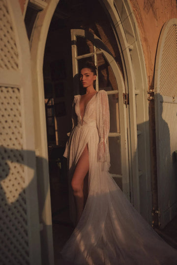 Robe de mariée fourreau intemporelle avec dentelle, décolleté en V et manches longues élégantes pour un look de mariée gracieux et sophistiqué