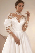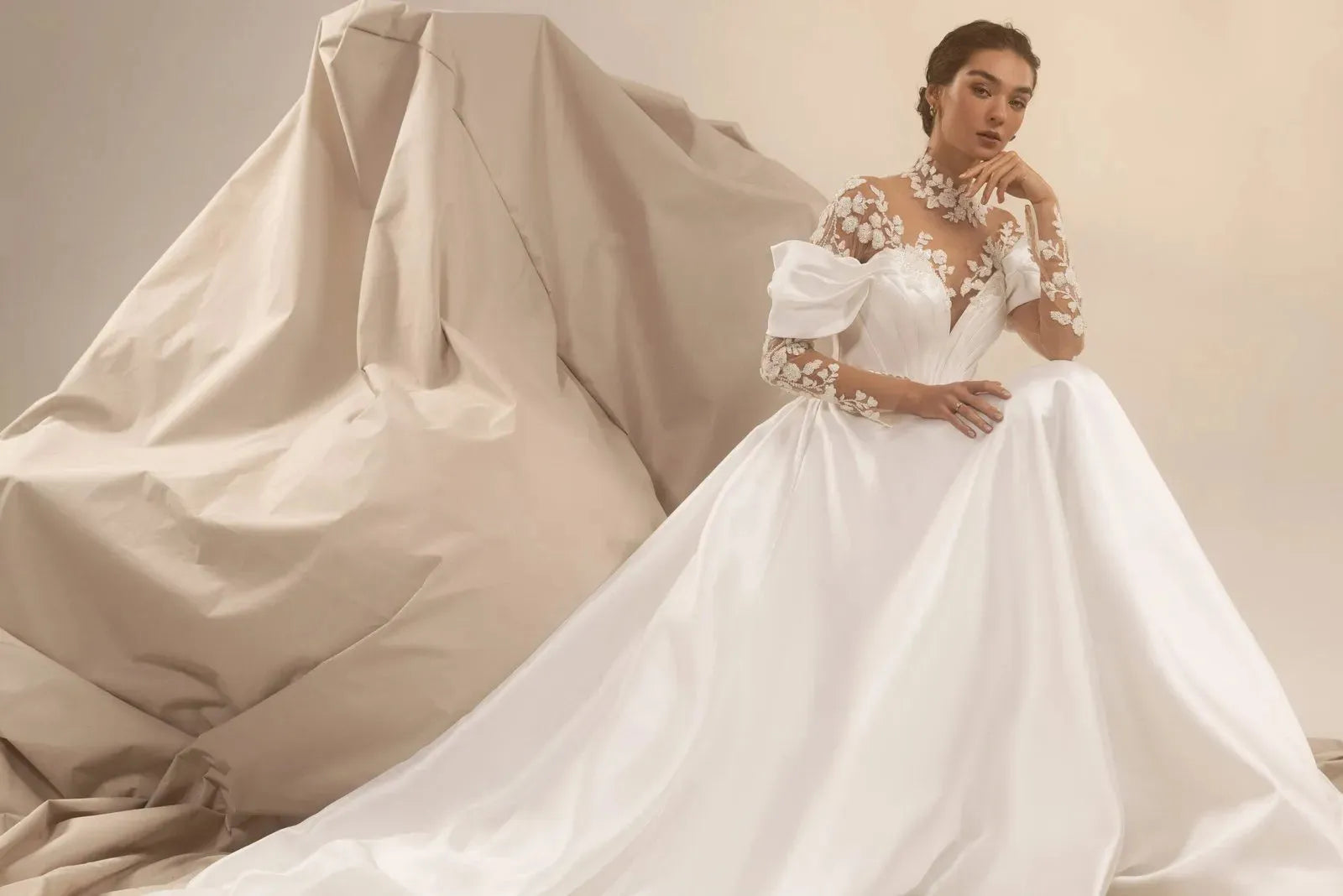 Robe de mariée minimaliste et fantaisiste avec tulle délicat, accents de satin et dentelle florale 3D romantique pour un look de mariée enchanteur