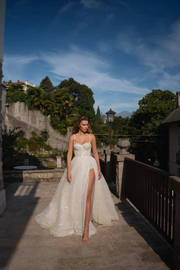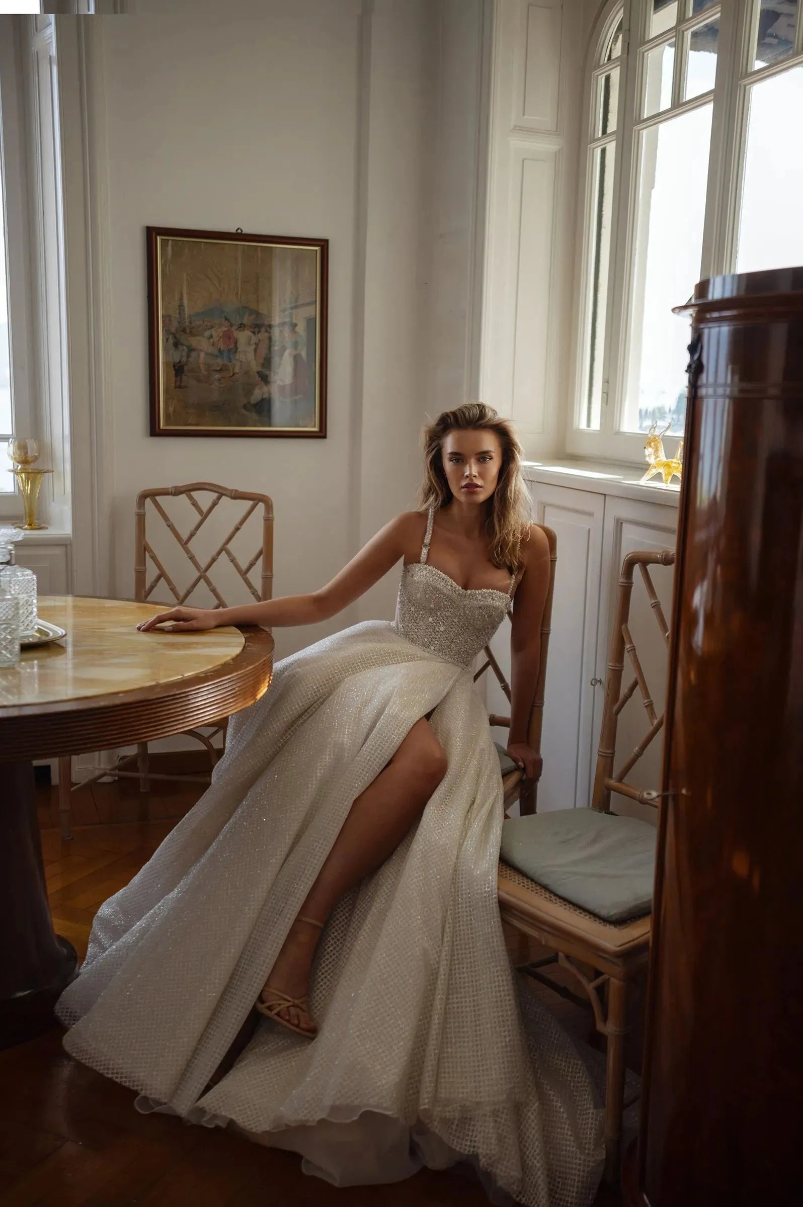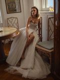Robe de mariée sexy en tulle pailleté à bretelles spaghetti et fente latérale