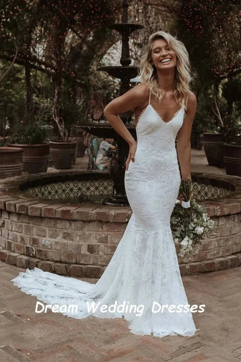 Robe de mariée sirène à bretelles spaghetti et col en V, en dentelle, style bohème, élégante, dos nu, sur mesure