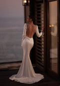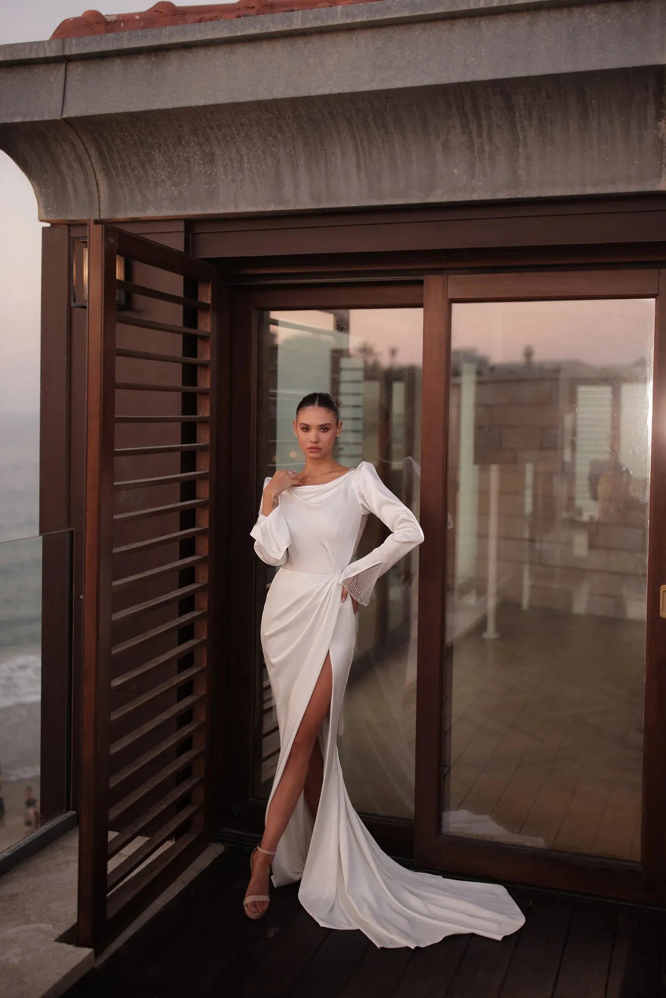 Robe de mariée sirène élégante, manches longues et décolleté bateau gracieux pour un look de mariée sophistiqué et intemporel