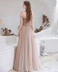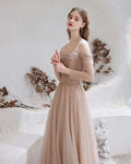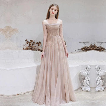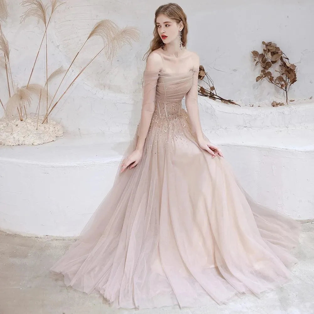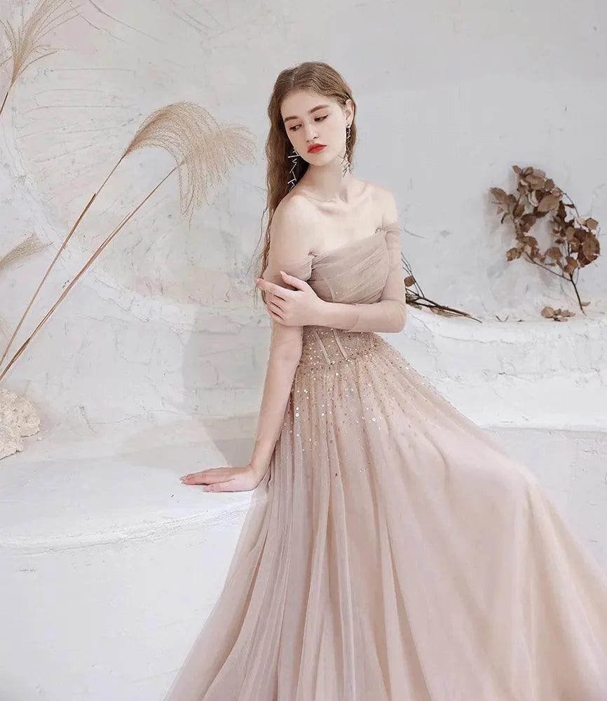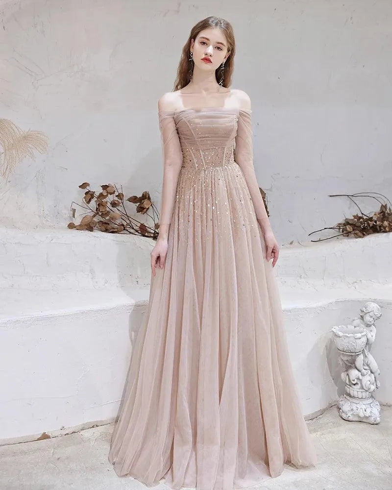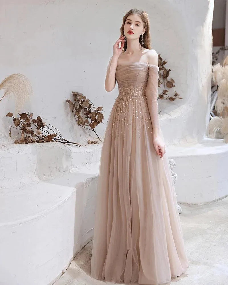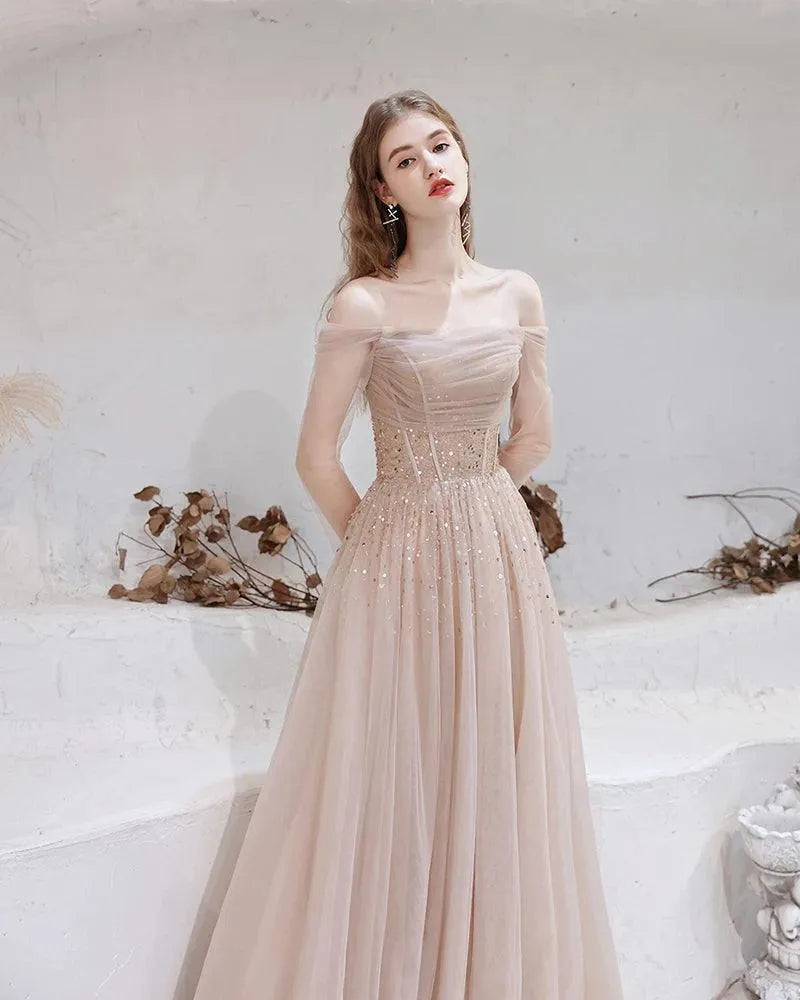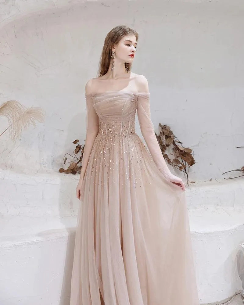 Robe de soirée rose nude, magnifique et sexy, épaules dénudées, perles, paillettes, manches longues