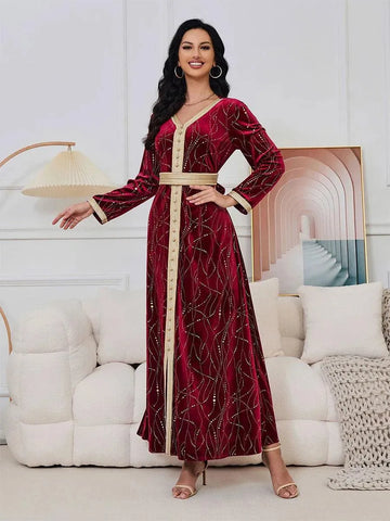 Robe de soirée rouge élégante en velours pour femme musulmane, automne-hiver, estampage doré, manches longues, col en V, avec ceintures