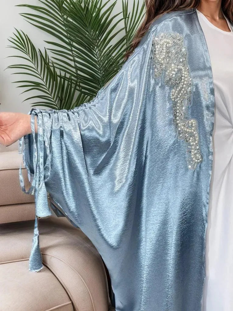 Robe longue élégante en satin pour femme musulmane, ouverte, avec perles, style abaya, kimono, maxi, pour la Turquie, Dubaï, l'Aïd, la fête, le caftan, le Maroc, la jalabiya