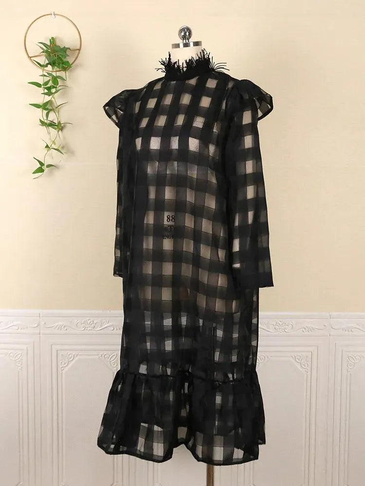 Robe longue noire grande taille à carreaux, transparente, manches longues, mi-longue, tenue d'été, d'automne, de soirée, de club, 2023