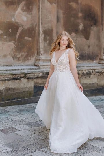 Robes de mariée élégantes grande taille, col en V, sans manches, avec appliques dans le dos, fermeture éclair, traîne, coupe trapèze, tulle