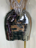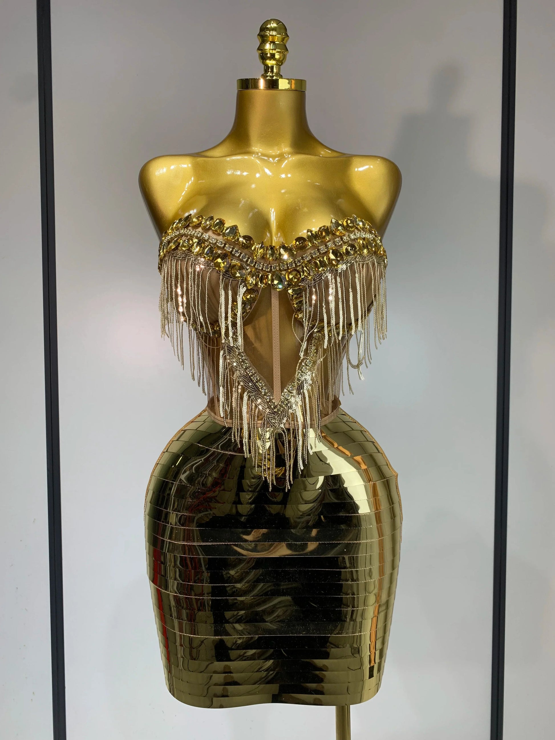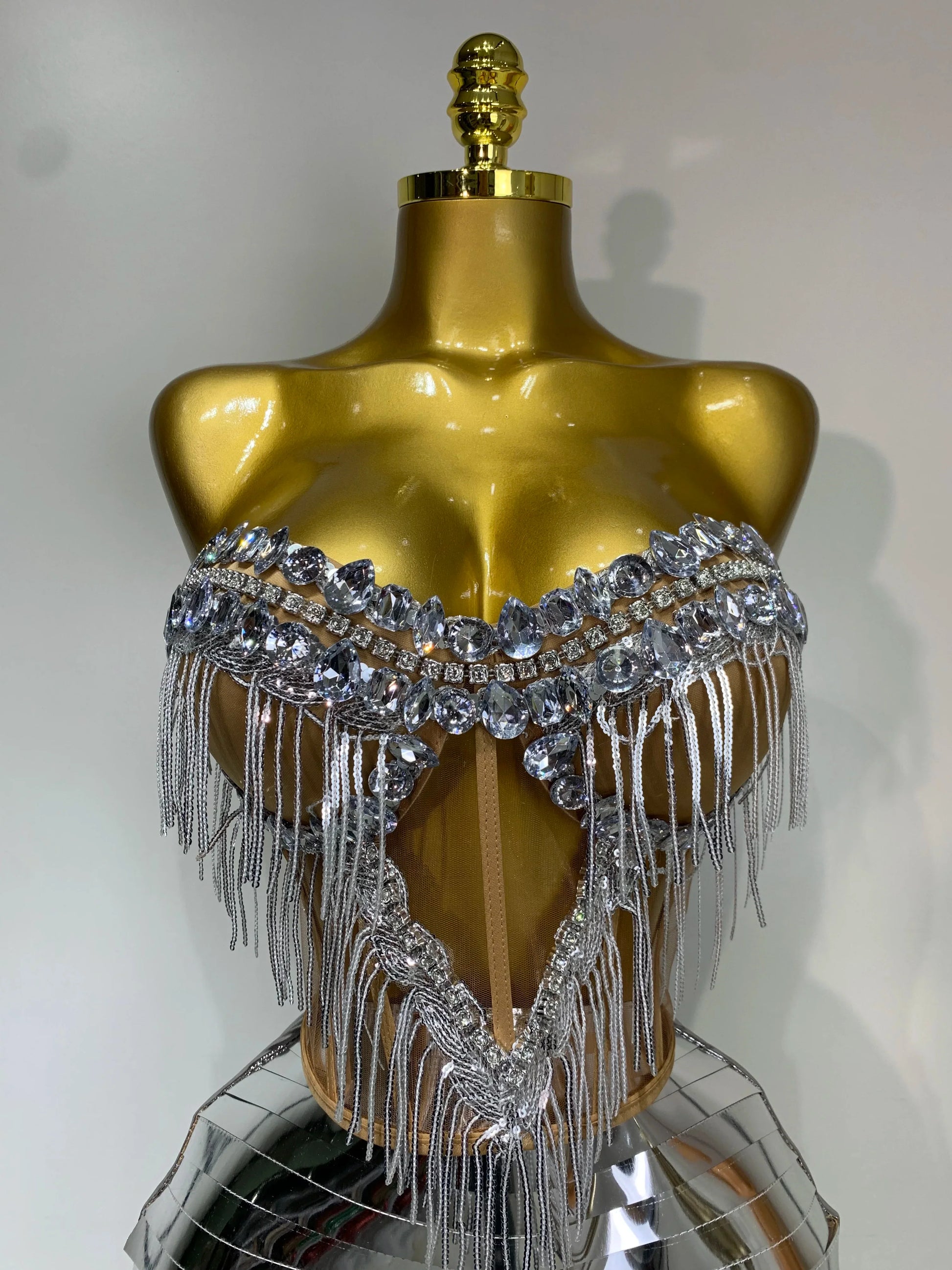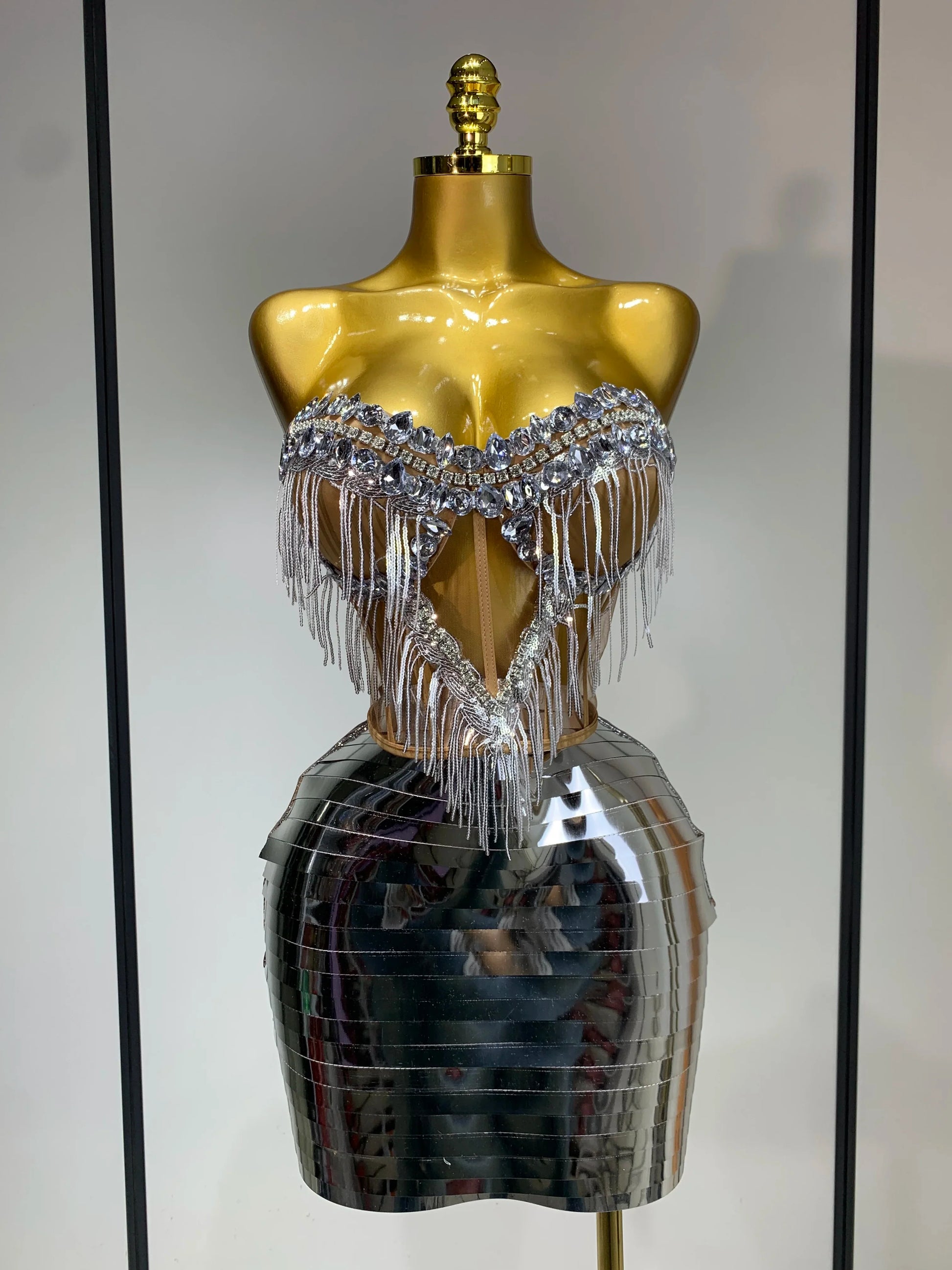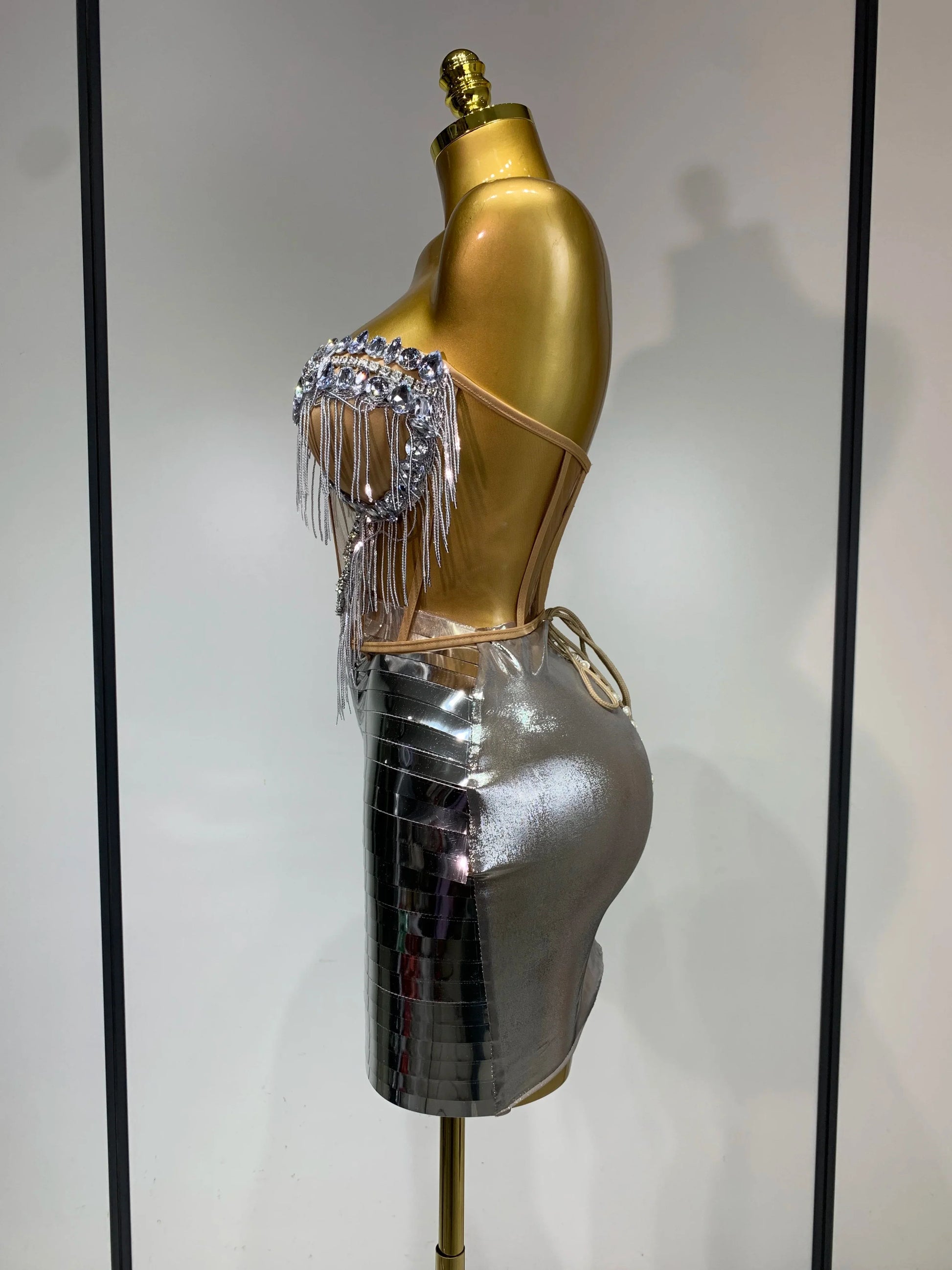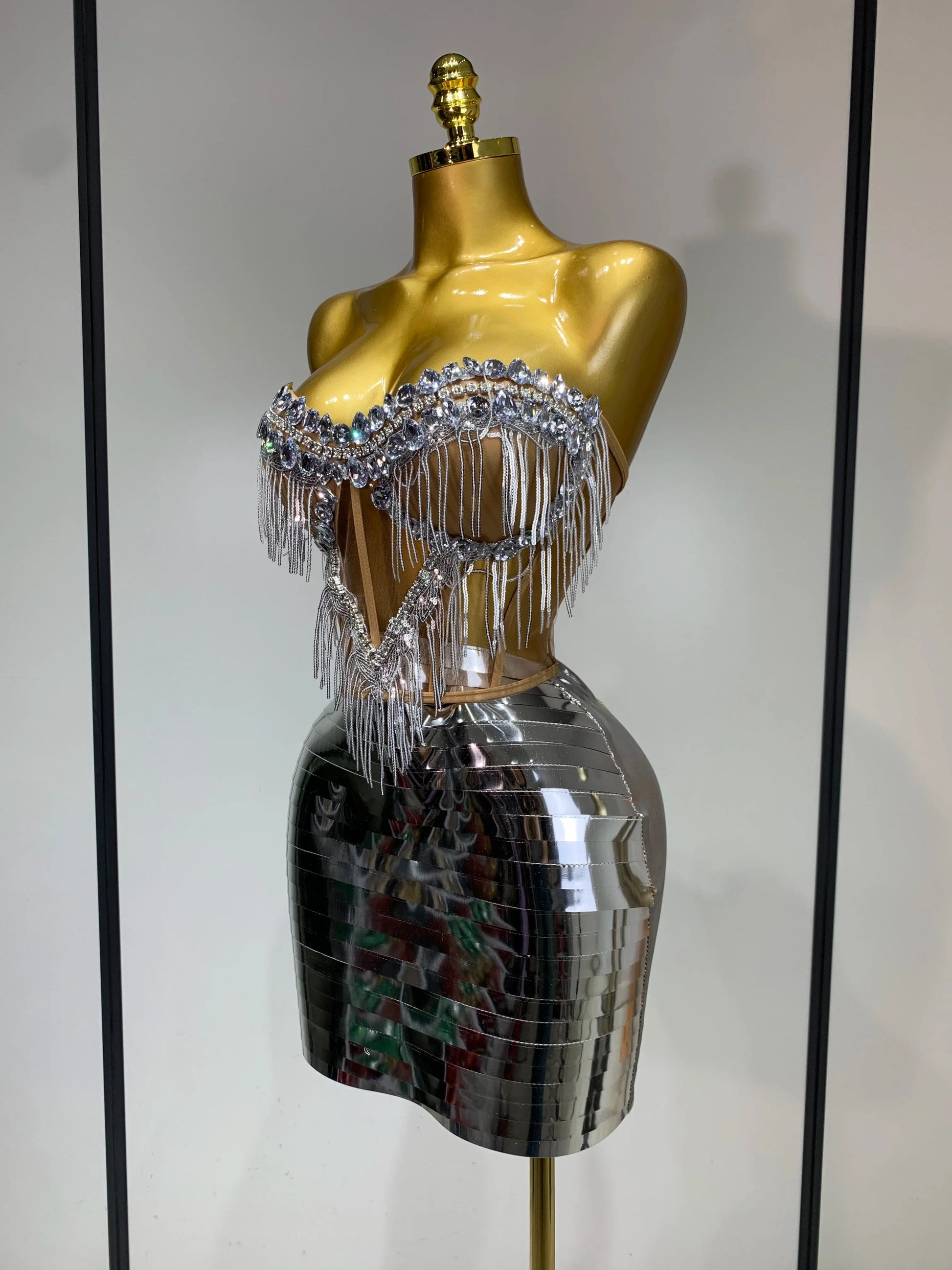 Sparkly Sliver Rhinstones tassels Top Skirt Two Piece Set Women Sexy Strapless Nightclub Birthday Evening Party Stage Outfit