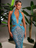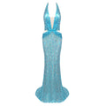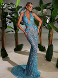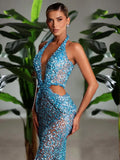 VC 2024 Blue Long Mermaid Party Dress Sequins Beaded Deep V Neck Plunge Halter Cut out Bodycon Cocktail Party Evening Gowns