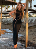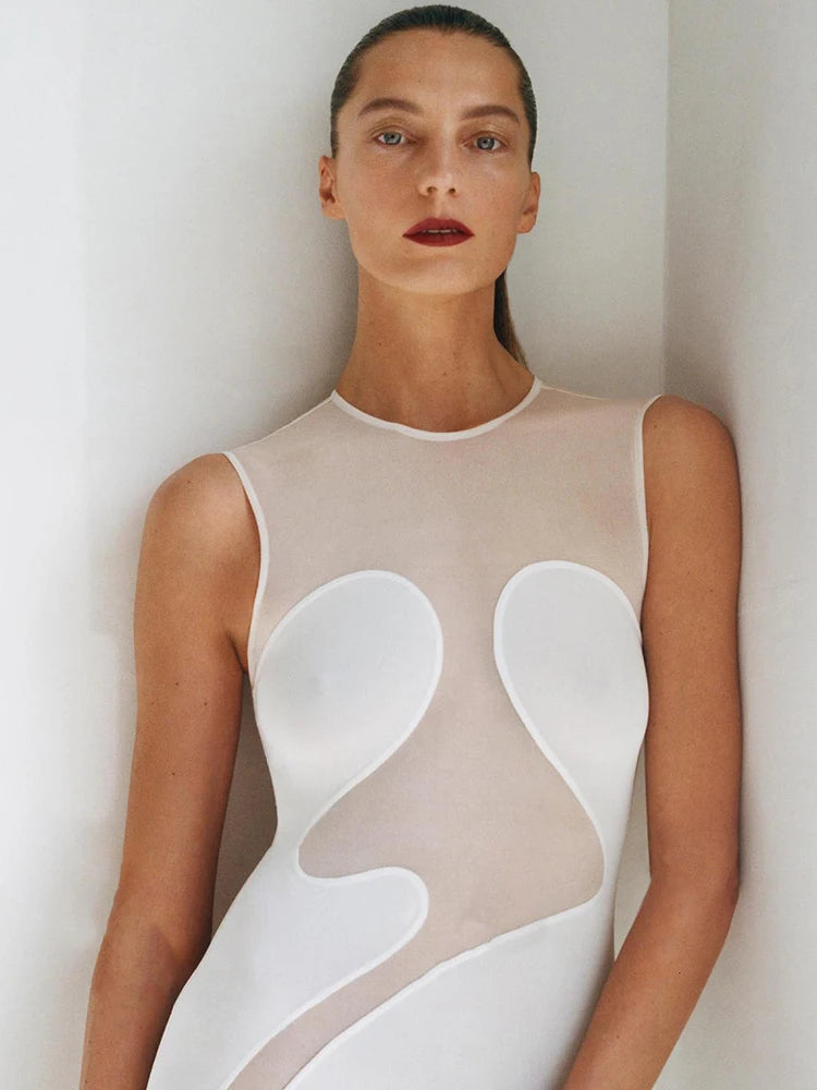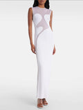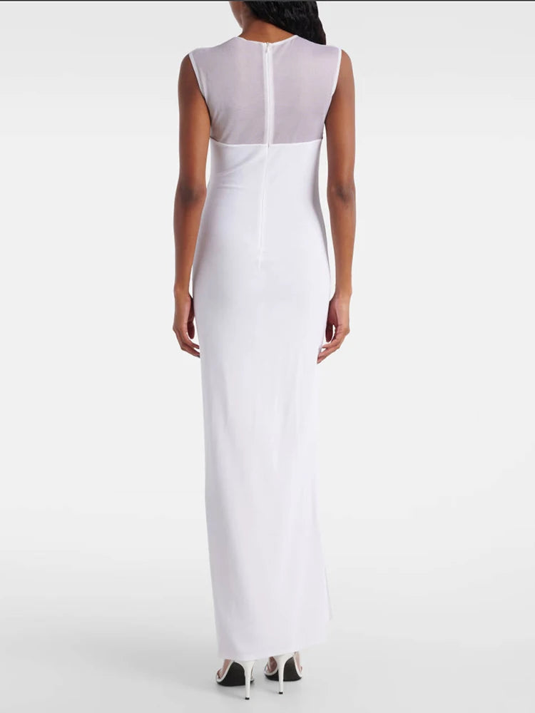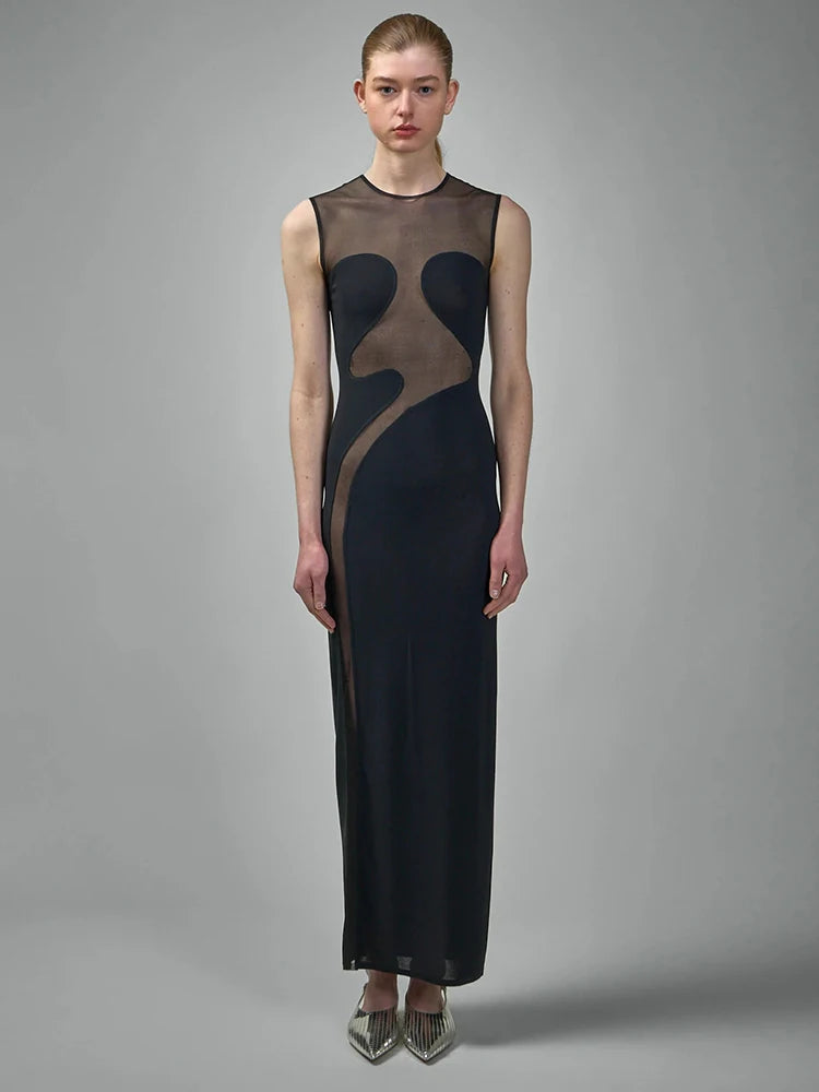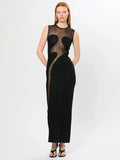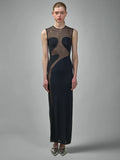 VC Cool Fashion Black White Sheer Mesh Sleeveless O-Neck Ankle Dress for Party Date Night Evening Gown