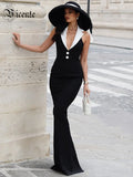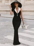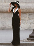 VC Stylish Black White Color Block Deep V-Neck Halter Sleeveless Long Dress Summer Date Daily Gown