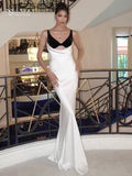 VC Women Cut-out Long Dress Temperament Contrast Color Combo V Neck Suspender Backless Slit Slim Mermaid Party Evening Gowns