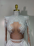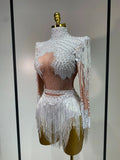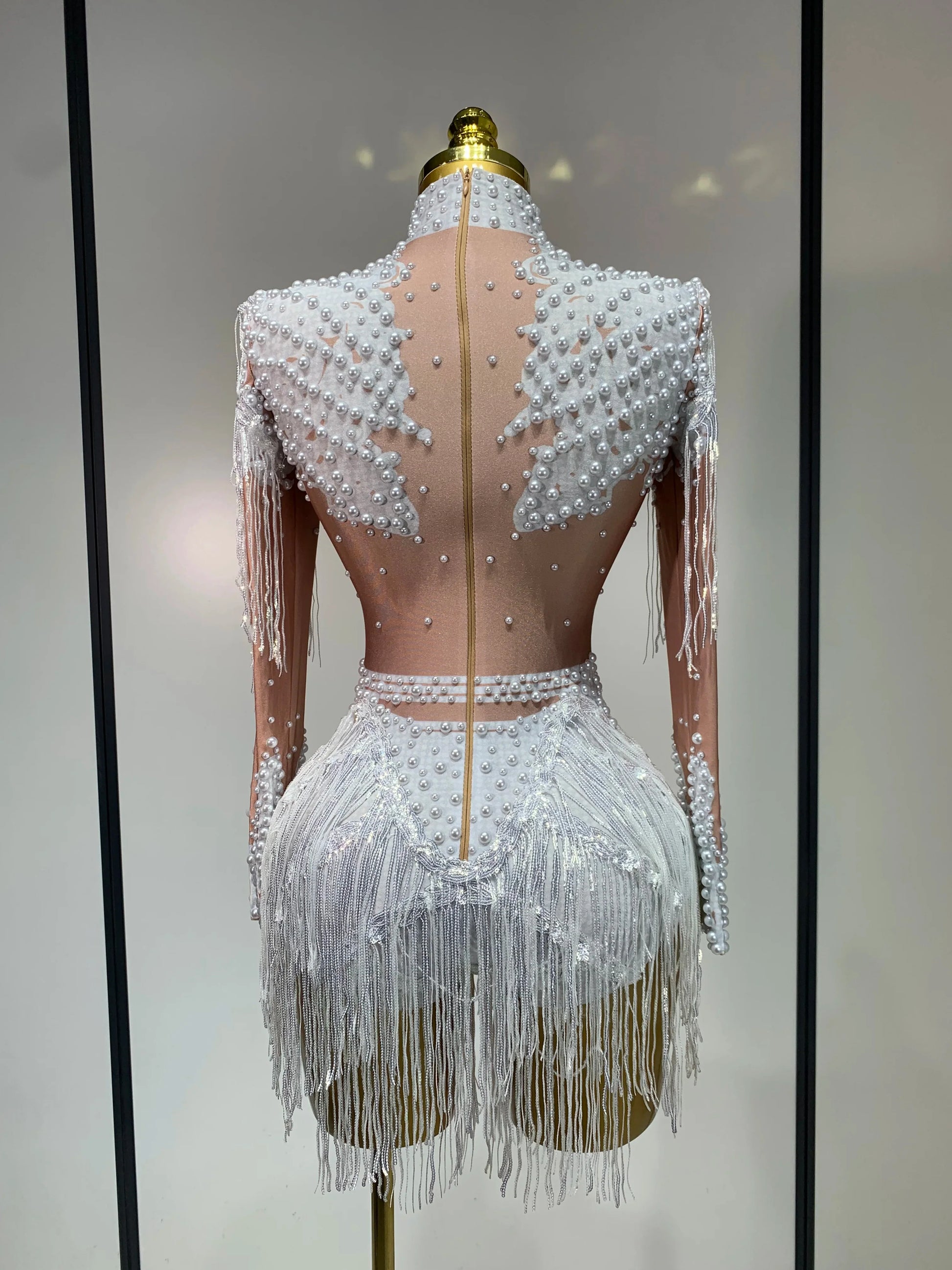 Women Long Sleeve Sexy Stretch Bodycon Shinning Tassels Rhinestones Bodysuit Celebrate Birthday Club Evening Party Stage Outfit