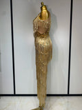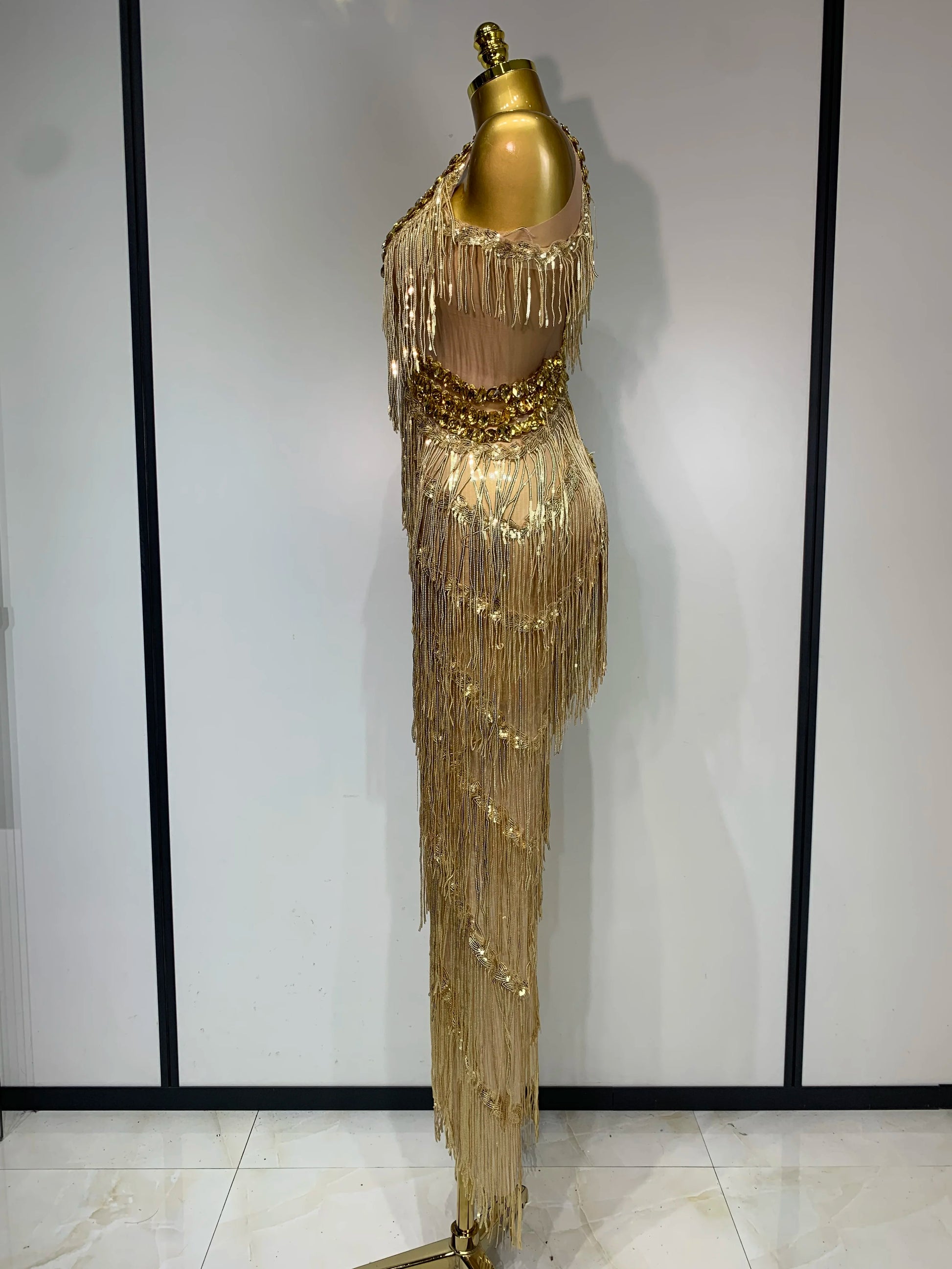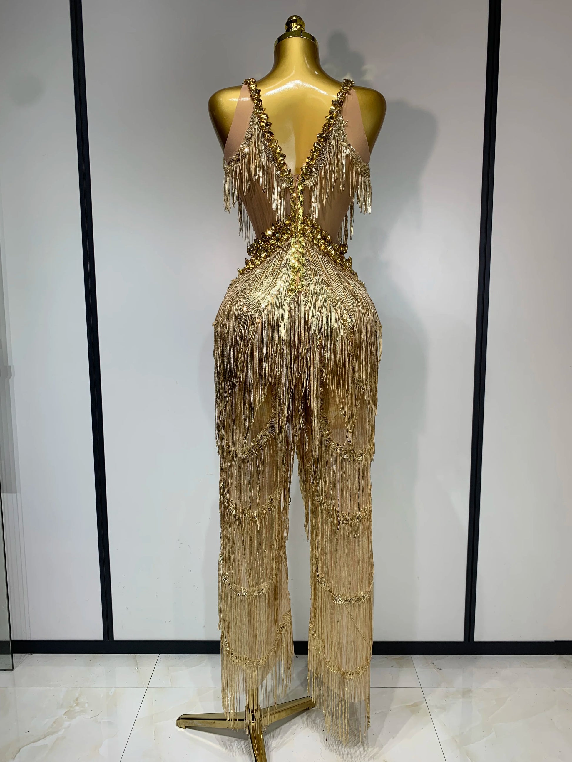 Women Sparkly Glod Rhinestones Sequined Fringe jumpsuit Sexy Nightclub Party Birthday Outfit Show Singer Stage Perform Costume