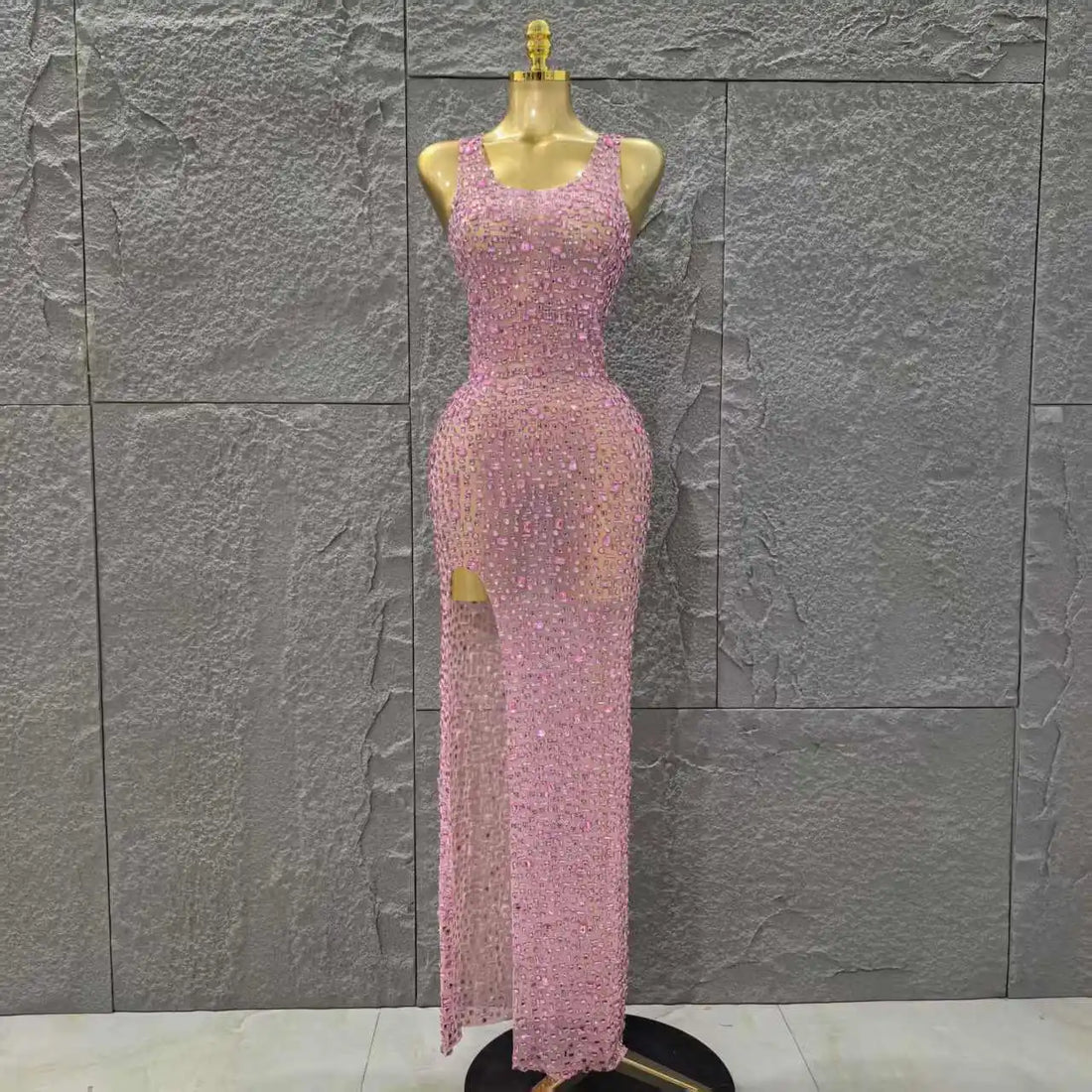 Handmake Top Quality Women Sleeveless Sexy O-Neck Mesh See Through Full Crystal Bodycon Long Dress Birthday Party Stage Wear