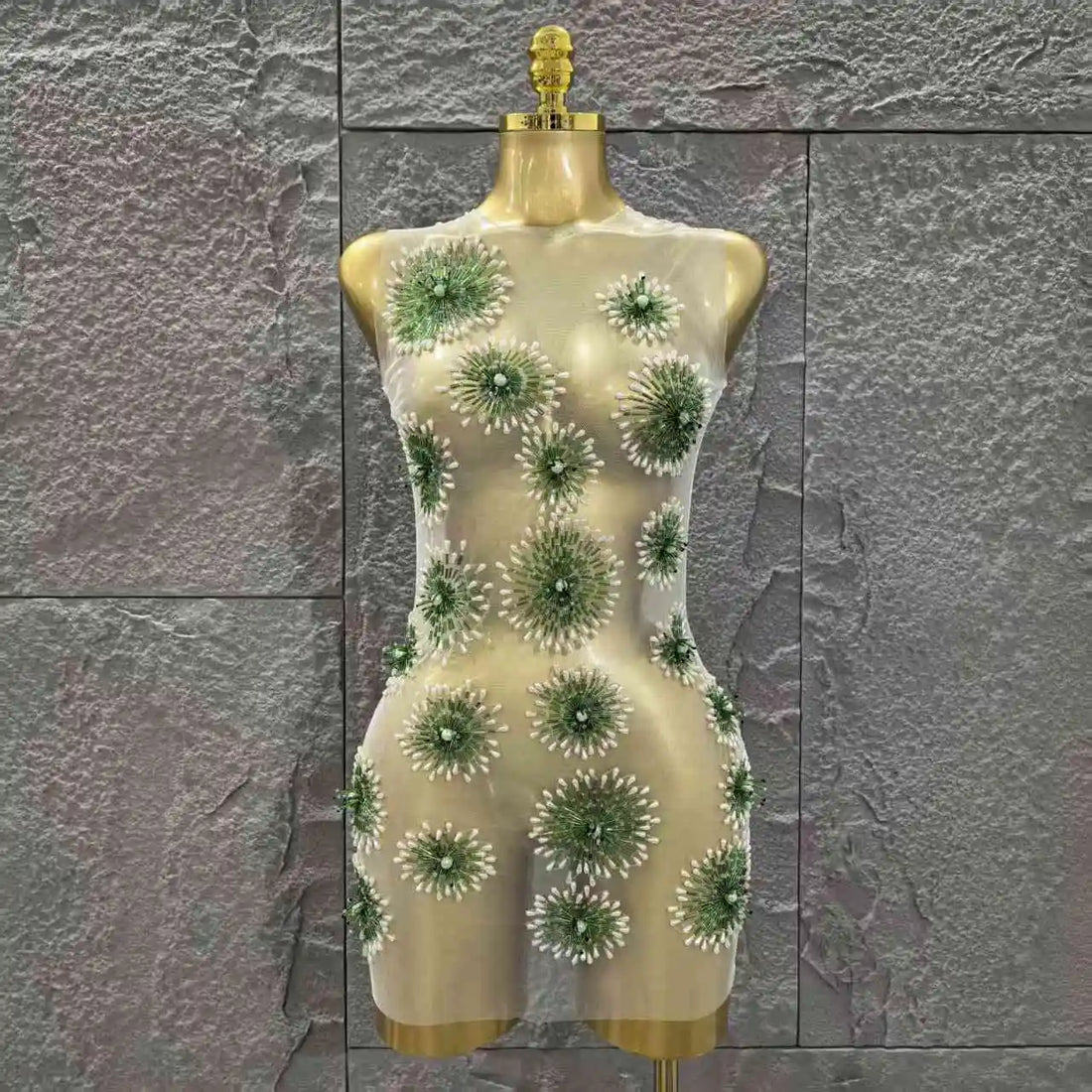 Mesh Ruffles Sexy See Through Bodycon Mini Dress Gloves Celebrate Nightclub Party Birthday Fashion Photo Shoot Wear