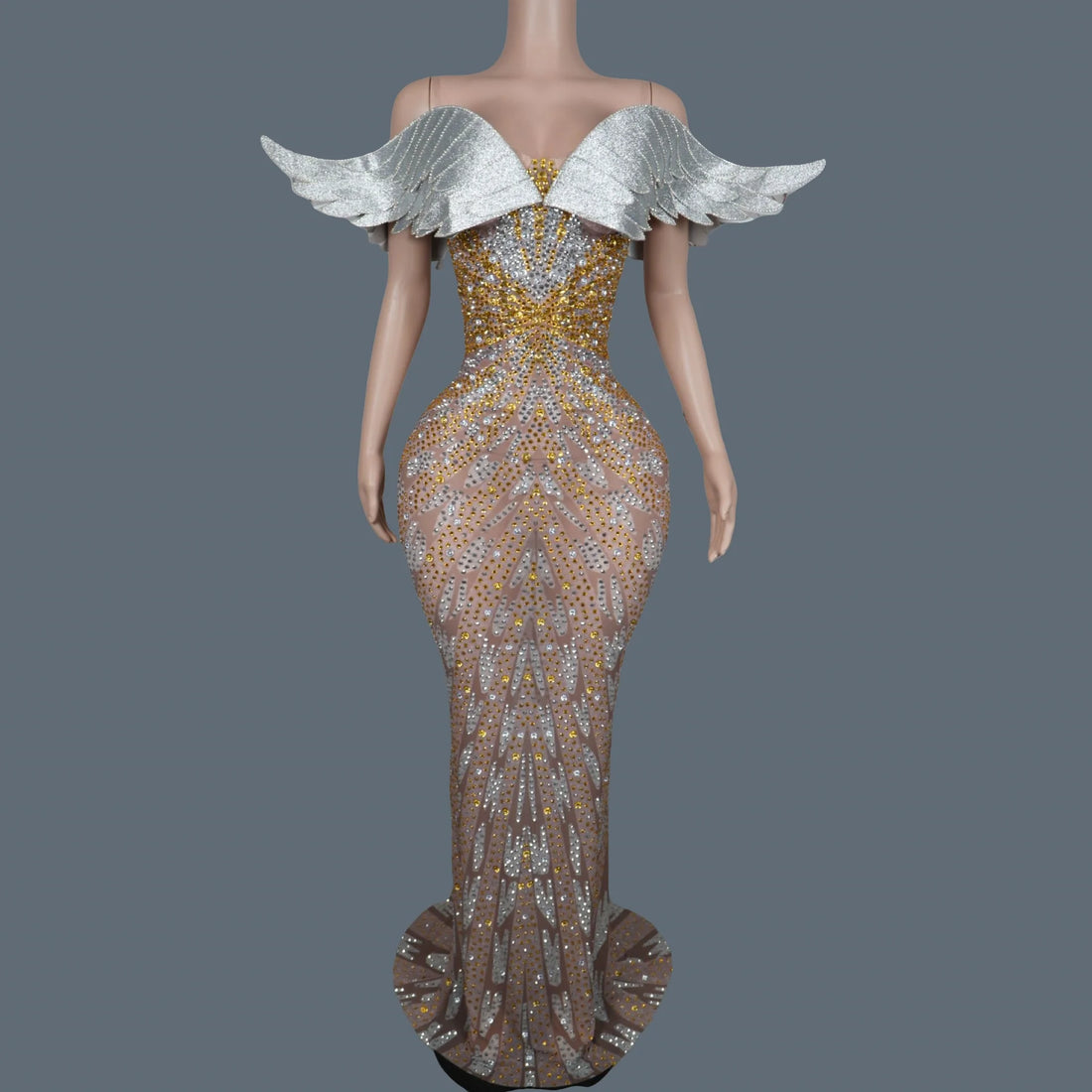 Luxury Sparkly Crystals Angel Gown Sexy Women Celebrate Party Dress High-end Wings Strapless Evening Dress Photo Shoot Wear Yuyi