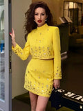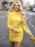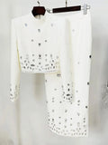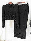2024 Heavy Industry Nail Bead Inlaid Diamond Short Skirt Set O-neck Long Sleeve Slim Fit Short Top+Nail Bead Skirt Two Piece Set