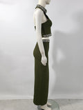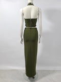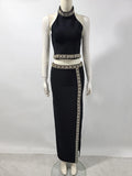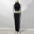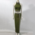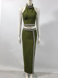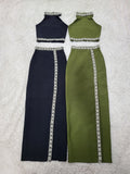 2025 Black Army Green Bandage Two Pieces Sets Sexy Diamond Bead Halter Top Long Skirt Women Bodycon Clothing Elegant Party Sets