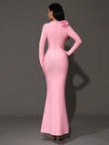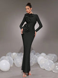 2025 Elegant Women's 3D Flower Decorative Bandage Dress O-neck Long Sleeve Bodycon Long Dress Cocktail Evening Party Vestidos