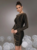 2025 Elegant Women's Light Luxury Rivet Design Bandage Dress O-neck Long Sleeve Bodycon Black Mini Dress Evening Party Vestidos