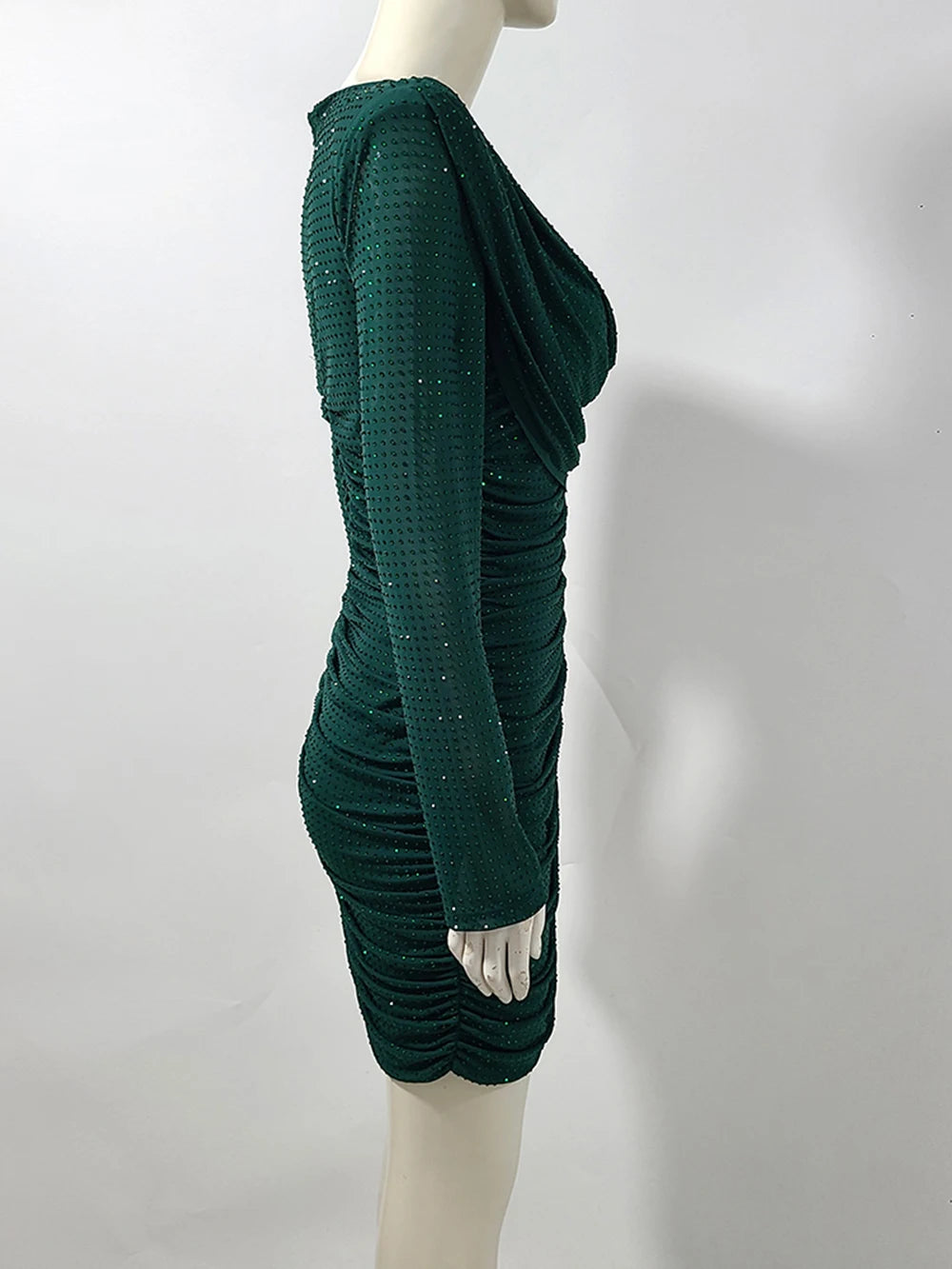 2025 New Rhinestone Long Sleeve Sexy Mini Dress For Women Fashion Shawl Collar Bodycon Club Dress Elegant Female Party Clothes