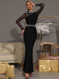 2025 Sexy Women Light Luxury Nail Bead Patchwork Bandage Dress Stand Collar Long Sleeved Bodycon Black Long Dress Party Vestidos