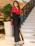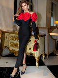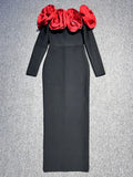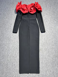2025 Sexy Women's 3D Red Large Flower Design Bandage Dress with One Collar Card Sleeve Bodycon Long Dress Evening Party Vestidos