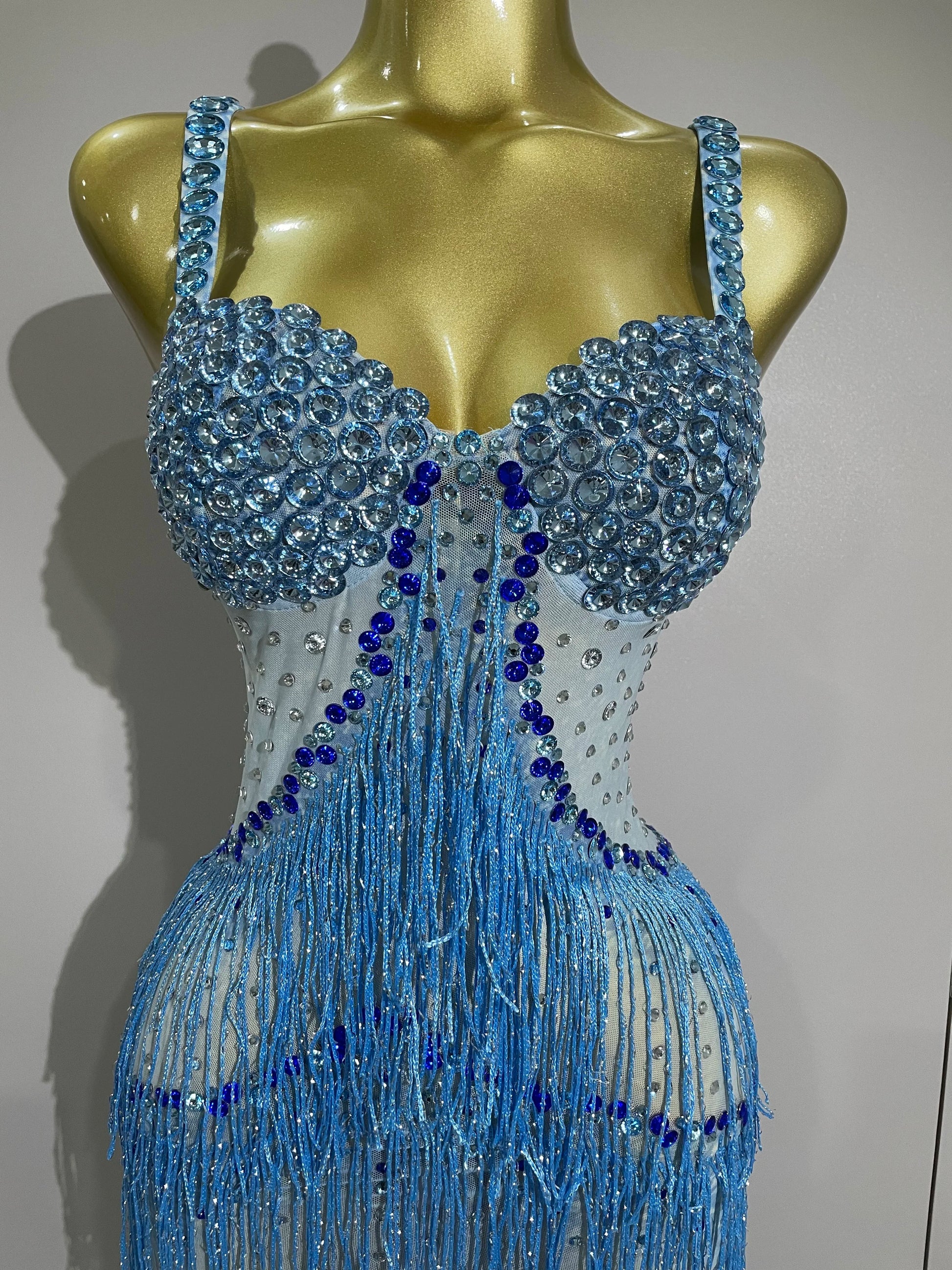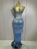 2025 Sparkly Rhinestones Tassel sexy Mesh Slip Long Dress Women Celebrate Evening Prom Birthday paty Dress Photoshoot Stage Wear