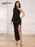 2025 Spring Women's Light Luxury Nail Diamond Bandage Dresses Stand Collar Single Shoulder Bodycon Split Length Dress Vestidos