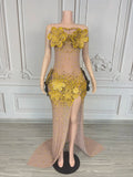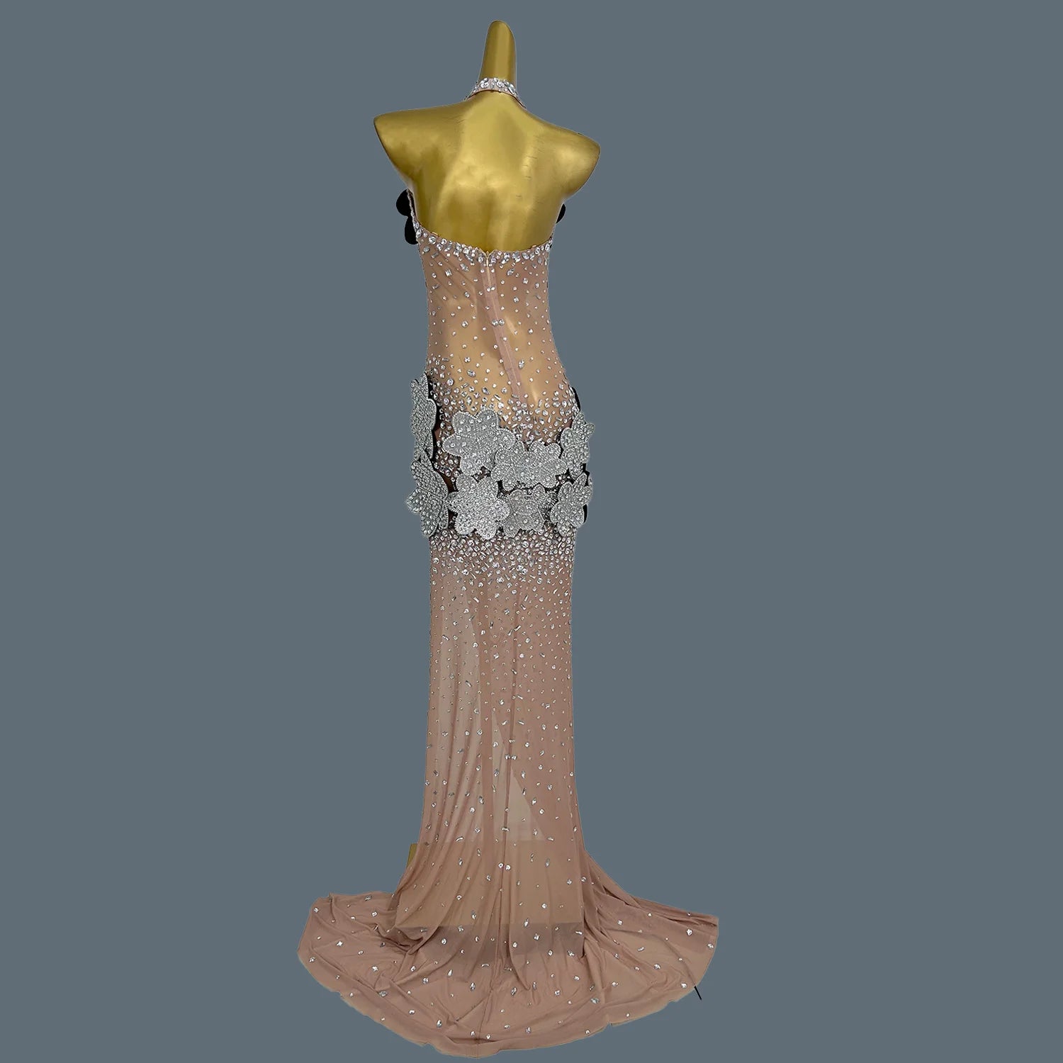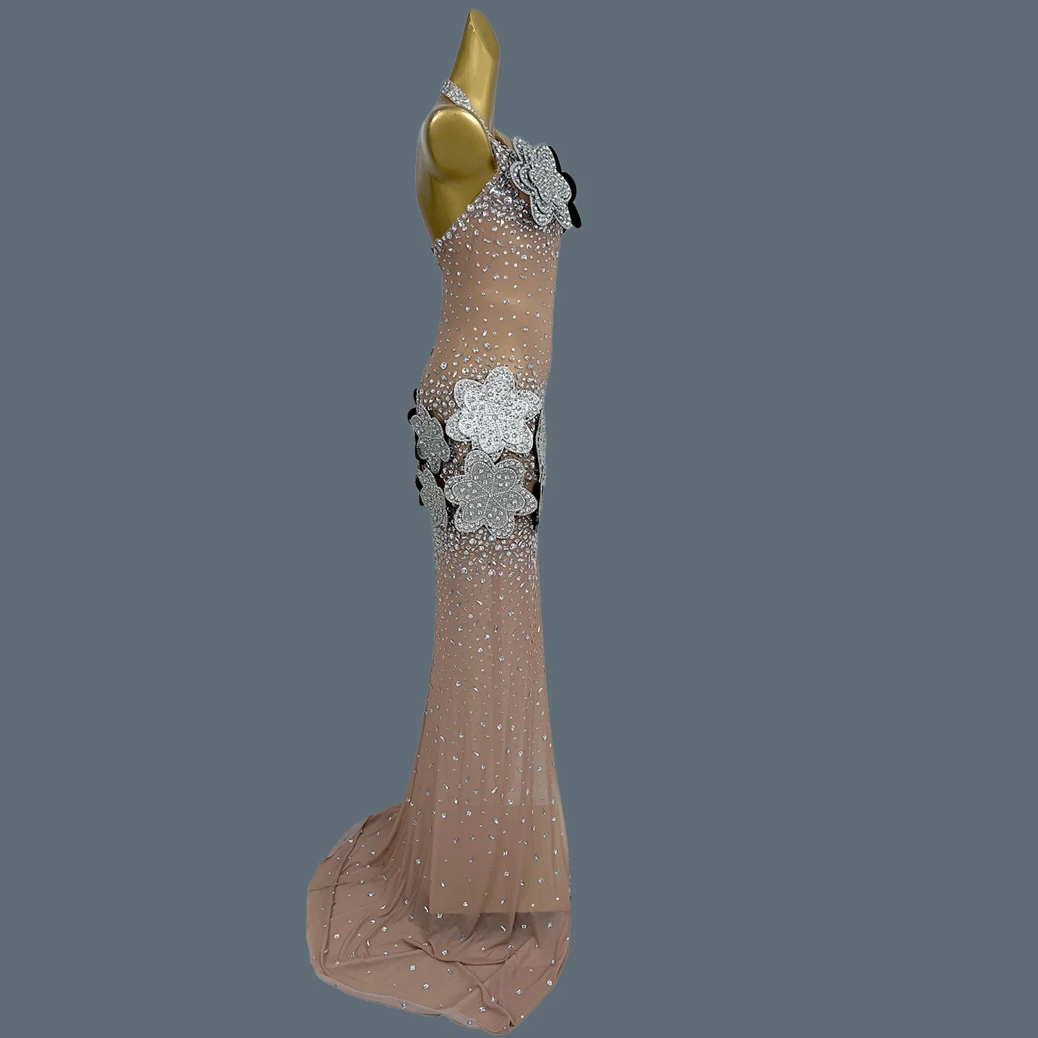 3D Flower See Through Mesh Evening Dress Sexy Women High end Couture Sparkly Rhinestone Party Long Dress Event Outfit Tiehua